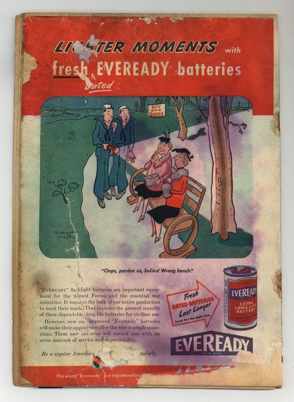 Starts Apr 4 Cover by Dick Sprang. Stories by Don C. Cameron, Jack Farr and unknown. Art by Dick Sprang, Jack Farr, Howard Sherman, George Roussos and Louis Cazeneuve. Bruce is saddled with the responsibility of taking care of a woman's twins for several days but when he accidentally discovers jewels inside one of the twin's rattles, the Batman takes over to prove the innocence of a store owner and ex-con charged with the theft of those jewels in the Batman and Robin tale "The Tyrannical Twins!" by Don C. Cameron and Dick Sprang. Plus: Three-Ring Binks in an untitled story by Jack Farr; Slam Bradley in "Shoplifter's Holiday!" with art by Howard Sherman; Air Wave in "A Talking Doll!" with art by George Roussos; and The Boy Commandos in "Gangway, Tokyo!" with art by Louis Cazeneuve (not by Simon and Kirby, despite the listed credits). Also: The Boners 1-pager by Lit-Win, and 2-page text story "Desk Job" by Tom Neill. 52 pages, full color. Cover price $0.10.
