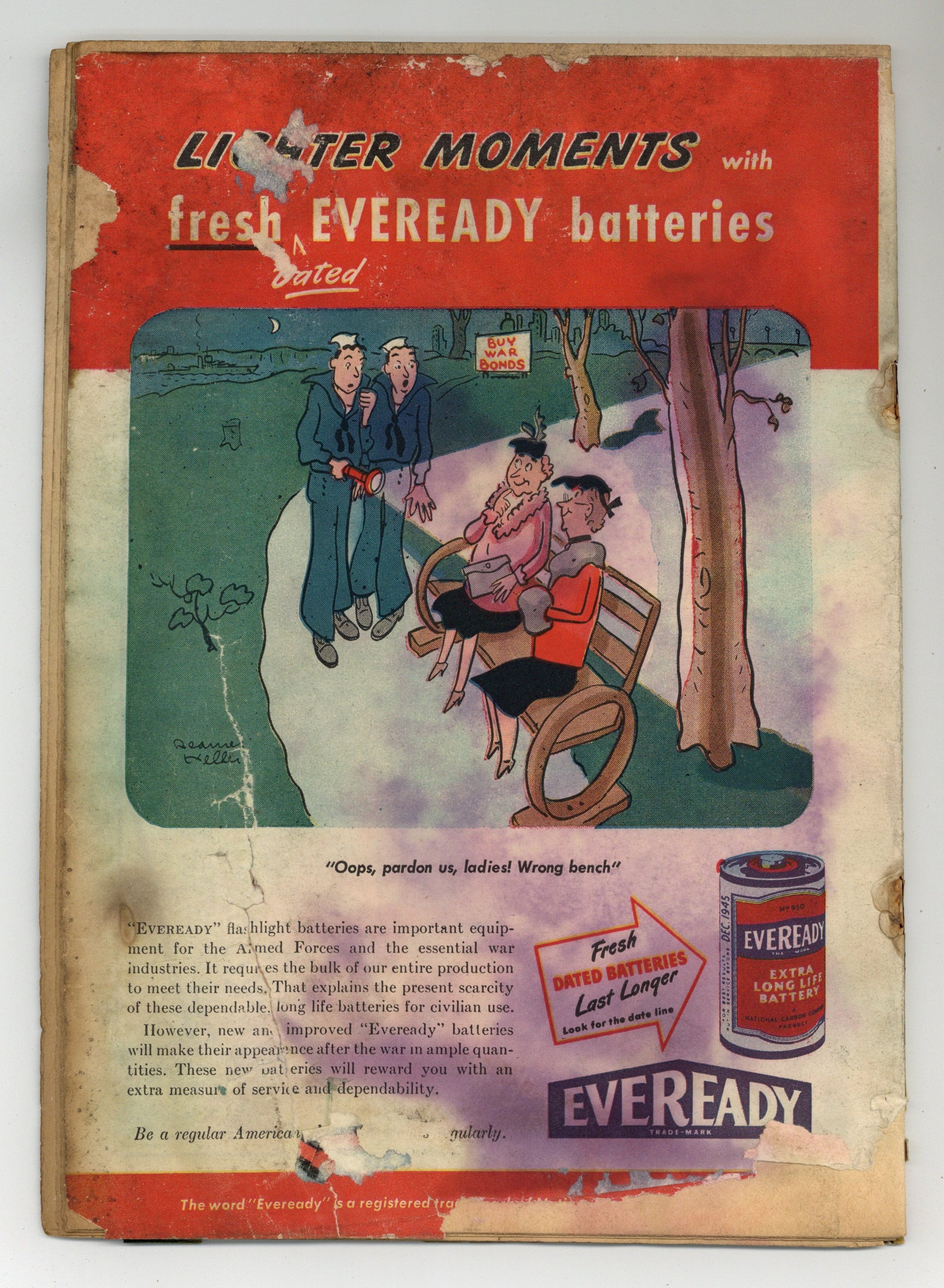 Cover partially TRIMMED. Heavy tape on cover, pieces on centerfold. Interior staining