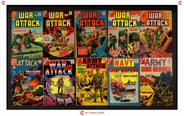 Issues 54-56, 59, 63 of War and Attack (1964); Army War Heroes (1963) 13; Navy War Heroes (1964) 6; Army Attack (1964) 46; Special War Series (1965) 3; and Attack (1966 4th Series Charlton) 4. Most will grade in the GD- to VG+ range.