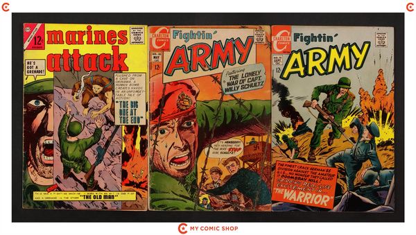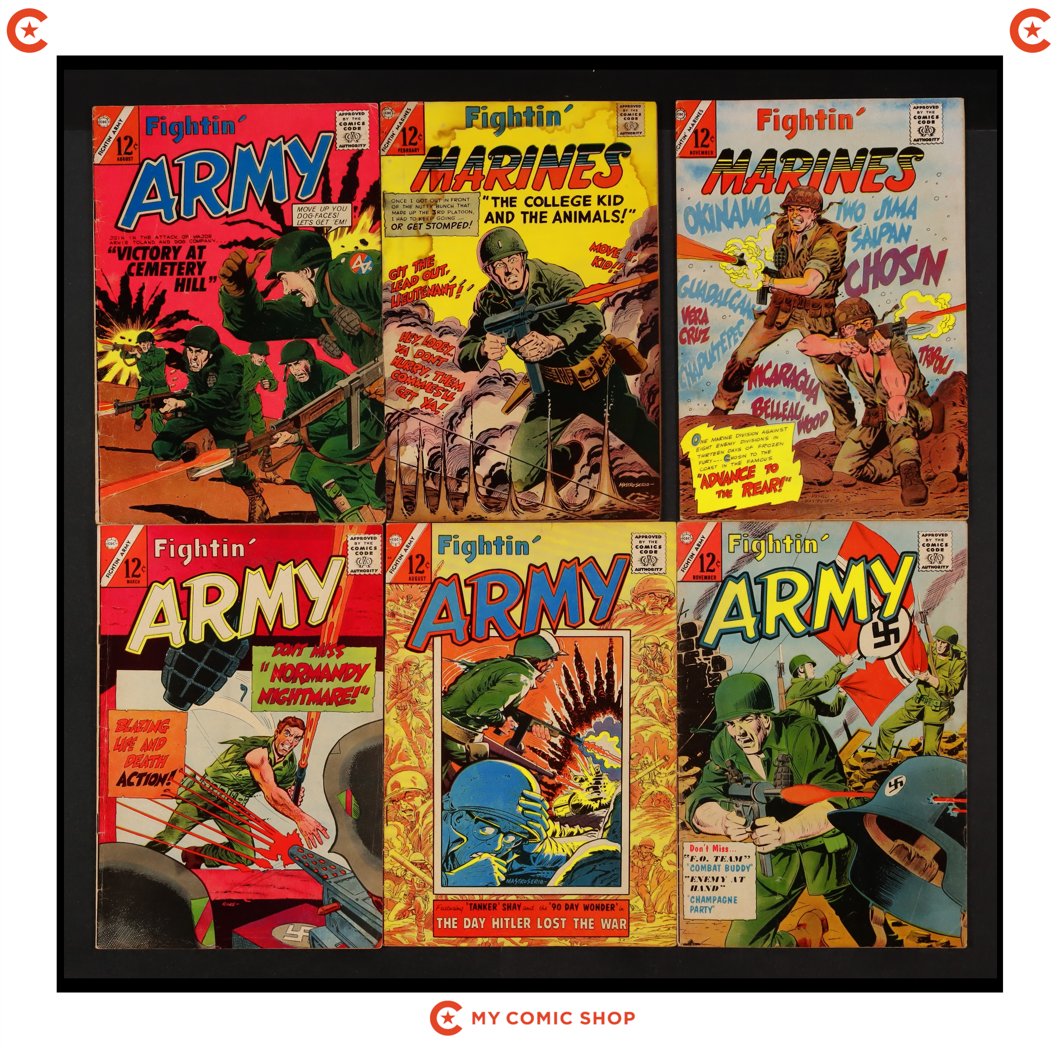 Issues 66, 73 of Fightin' Marines (1951 St. John/Charlton); 59, 60, 64, 67, 81, 85 of Fightin' Army (1956 Charlton); and Marines Attack (1964 Charlton) 2. Most will grade in the GD to VG/FN range, with Fightin' Marines #73 grading at PR (water damage).