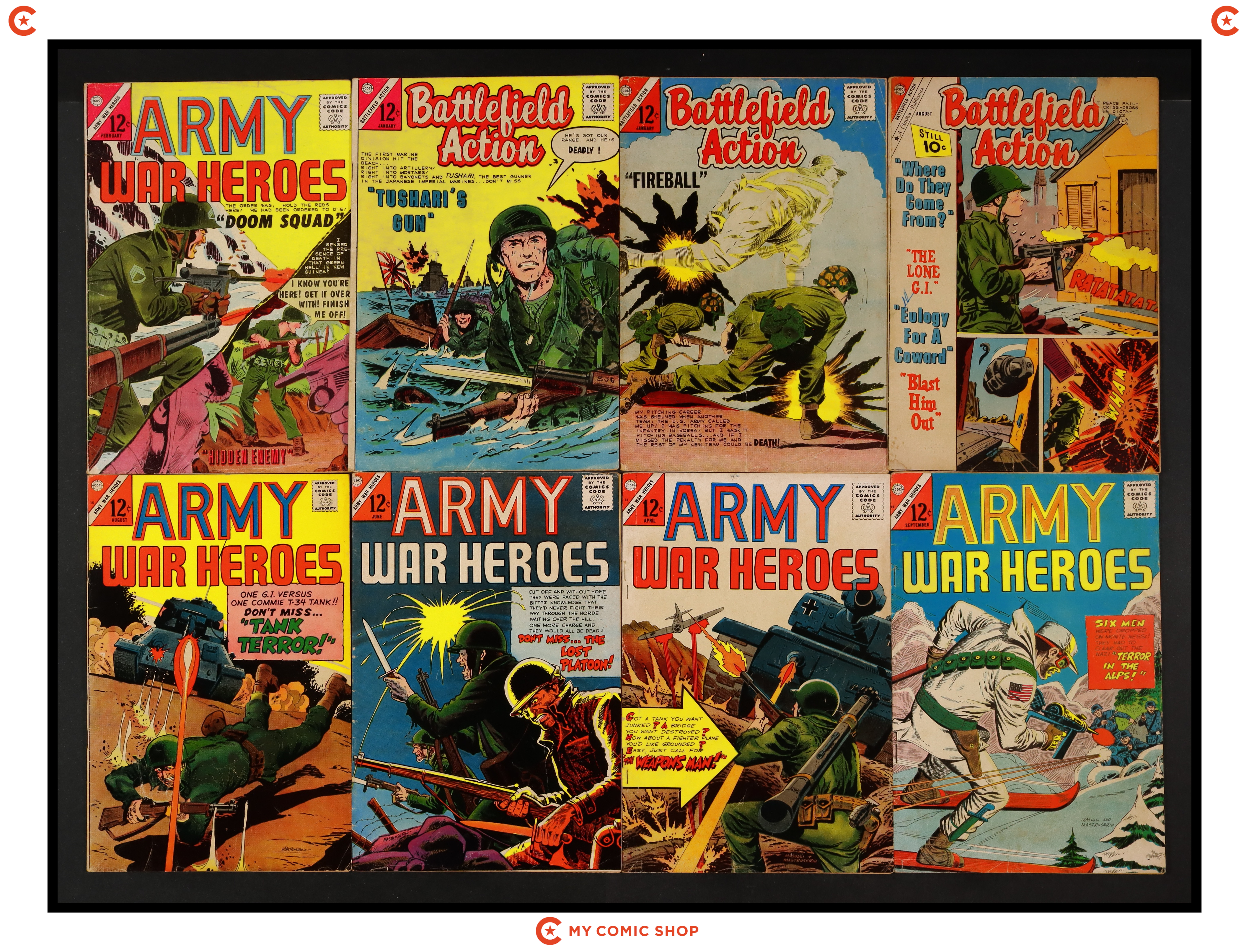 Issues 37, 51, 56 of Battlefield Action (1957); and 7, 10, 13, 14, 15 of Army War Heroes (1963). Most will grade in the GD to VG/FN range.