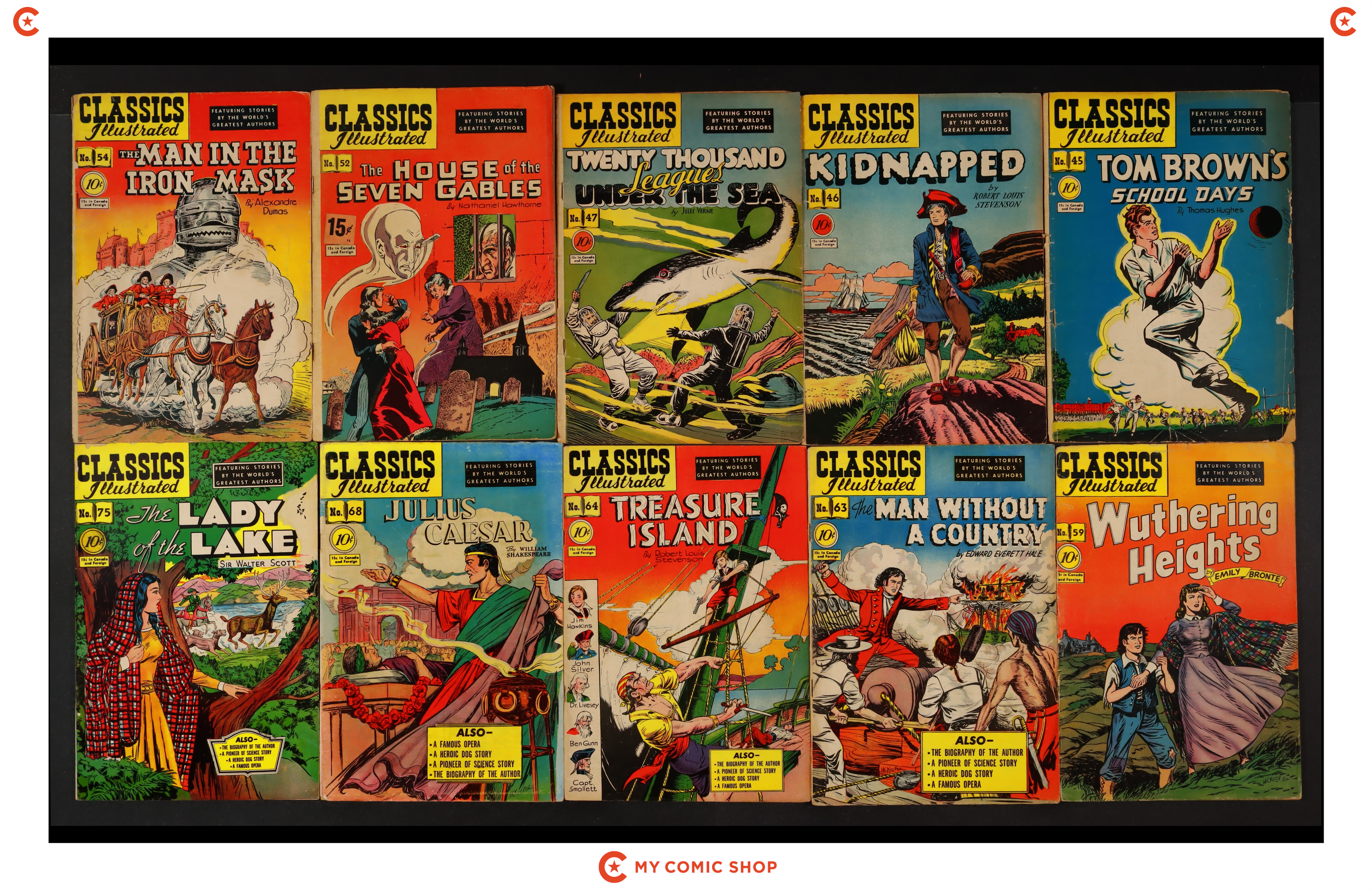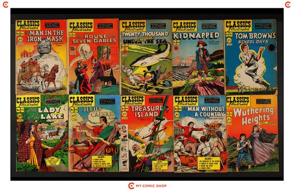 Classics Illustrated 045 Tom Brown's School Days (1948) 1; 046 Kidnapped (1948) 1; 047 20,000 Leagues Under the Sea (1948) 1; 052 The House of Seven Gables (1948) 1; 054 Man in the Iron Mask (1948) 1; 059 Wuthering Heights (1949) 1; 063 The Man Without a Country (1949) 1; 064 Treasure Island (1949) 1; 068 Julius Caesar (1950) 1; and 075 The Lady of the Lake (1950) 1. Most will grade in the GD to VG+ range.