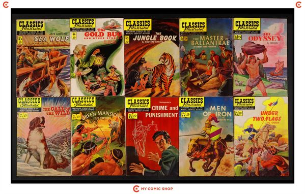 Classics Illustrated 081 The Odyssey (1951) 1; 082 The Master of Ballantrae (1951) 1; 083 The Jungle Book (1951) 1; 084 The Gold Bug and Other Stories (1951) 1; 085 The Sea Wolf (1951) 1; 086 Under Two Flags (1951) 1; 088 Men of Iron (1951) 1; 089 Crime and Punishment (1951) 1; 090 Green Mansions (1951) 1; and 091 The Call of the Wild (1951) 1. Most will grade in the GD/VG to FN range, with #85 grading at FR.