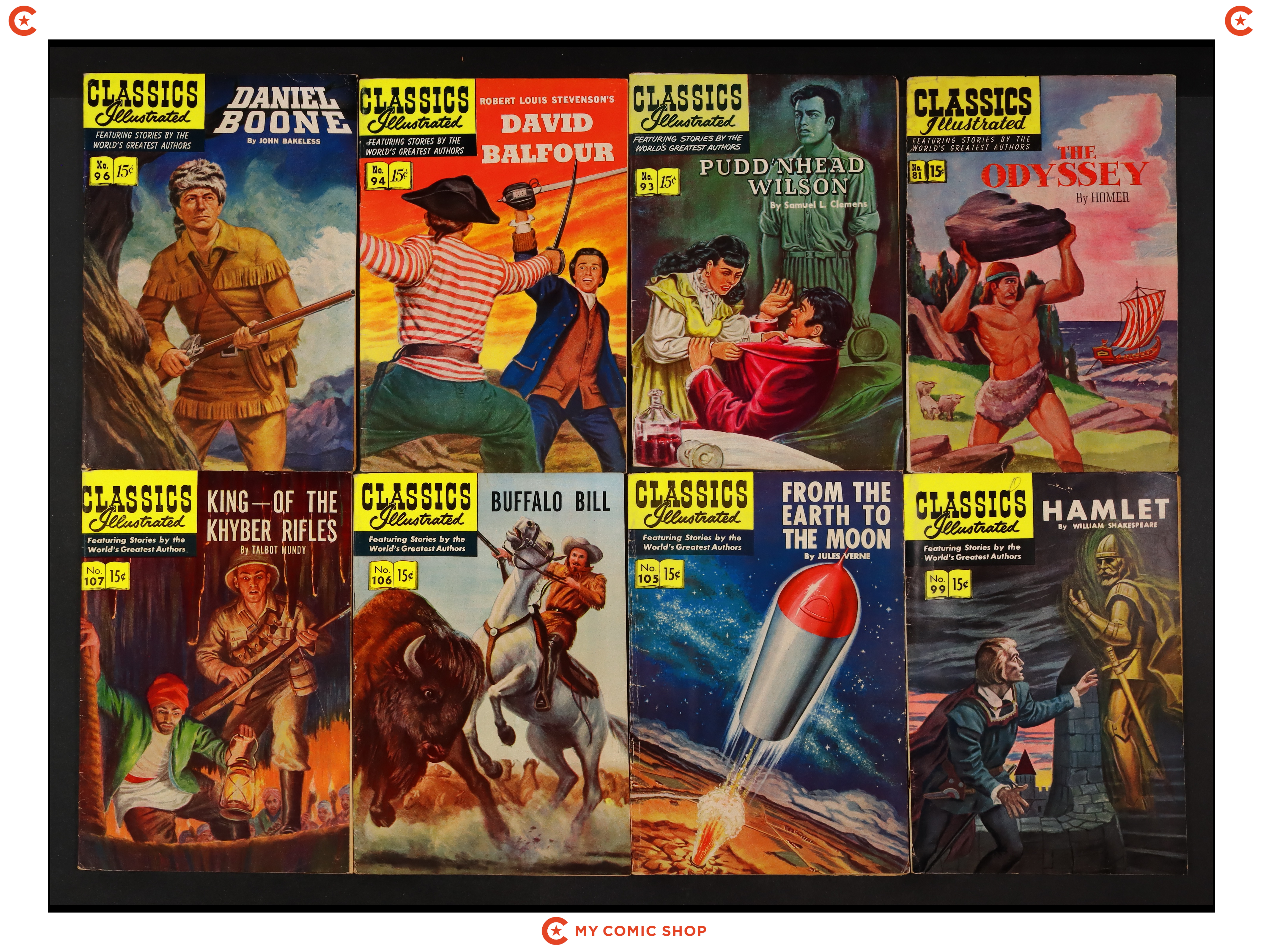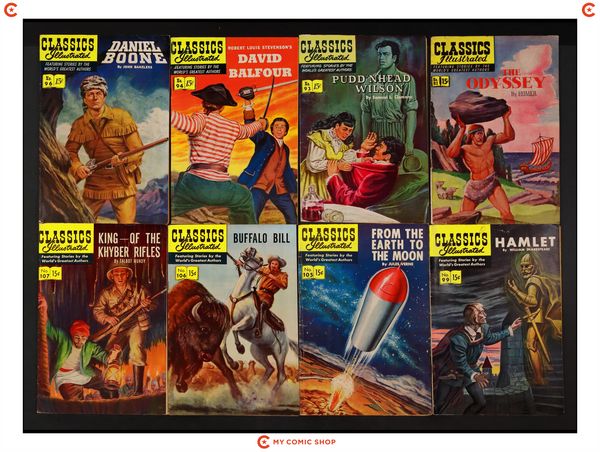Classics Illustrated 081 The Odyssey (1951) 1; 093 Pudd'nhead Wilson (1952) 1; 094 David Balfour (1952) 1; 096 Daniel Boone (1952) 1; 099 Hamlet (1952) 1; 105 From the Earth to the Moon (1953) 1; 106 Buffalo Bill (1953) 1; 107 King of the Khyber Rifles (1953) 1; 108 Knights of the Round Table (1953) 1A; 119 Soldiers of Fortune (1954) 1; and 144 The First Men in the Moon (1958) 1. Most will grade in the VG- to VG/FN range.