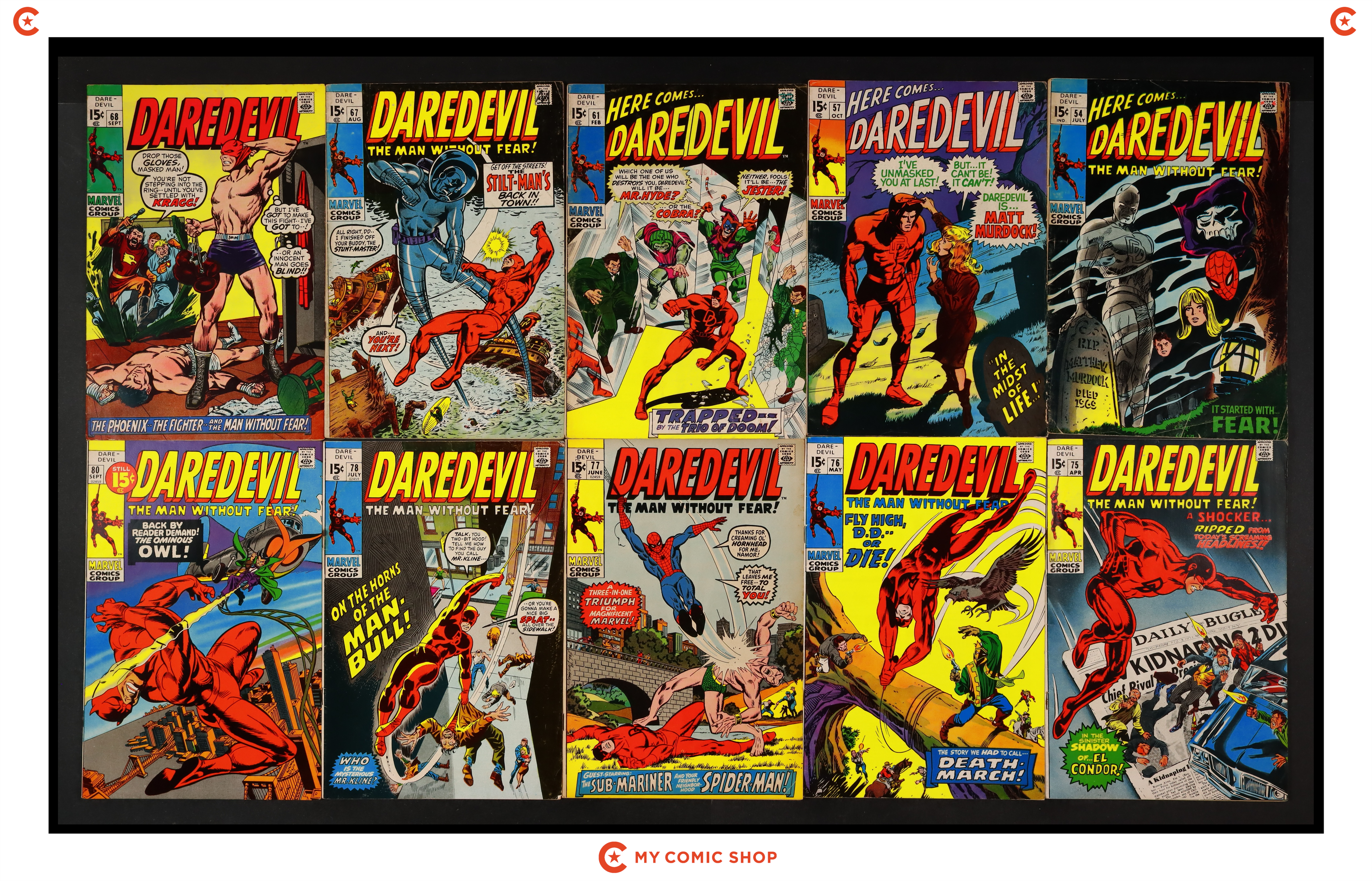 Issues 54, 57, 61, 67, 68, 75-78, and 80 of Daredevil (1964 1st Series). Most will grade in the FN to VG range with a couple grading GD.