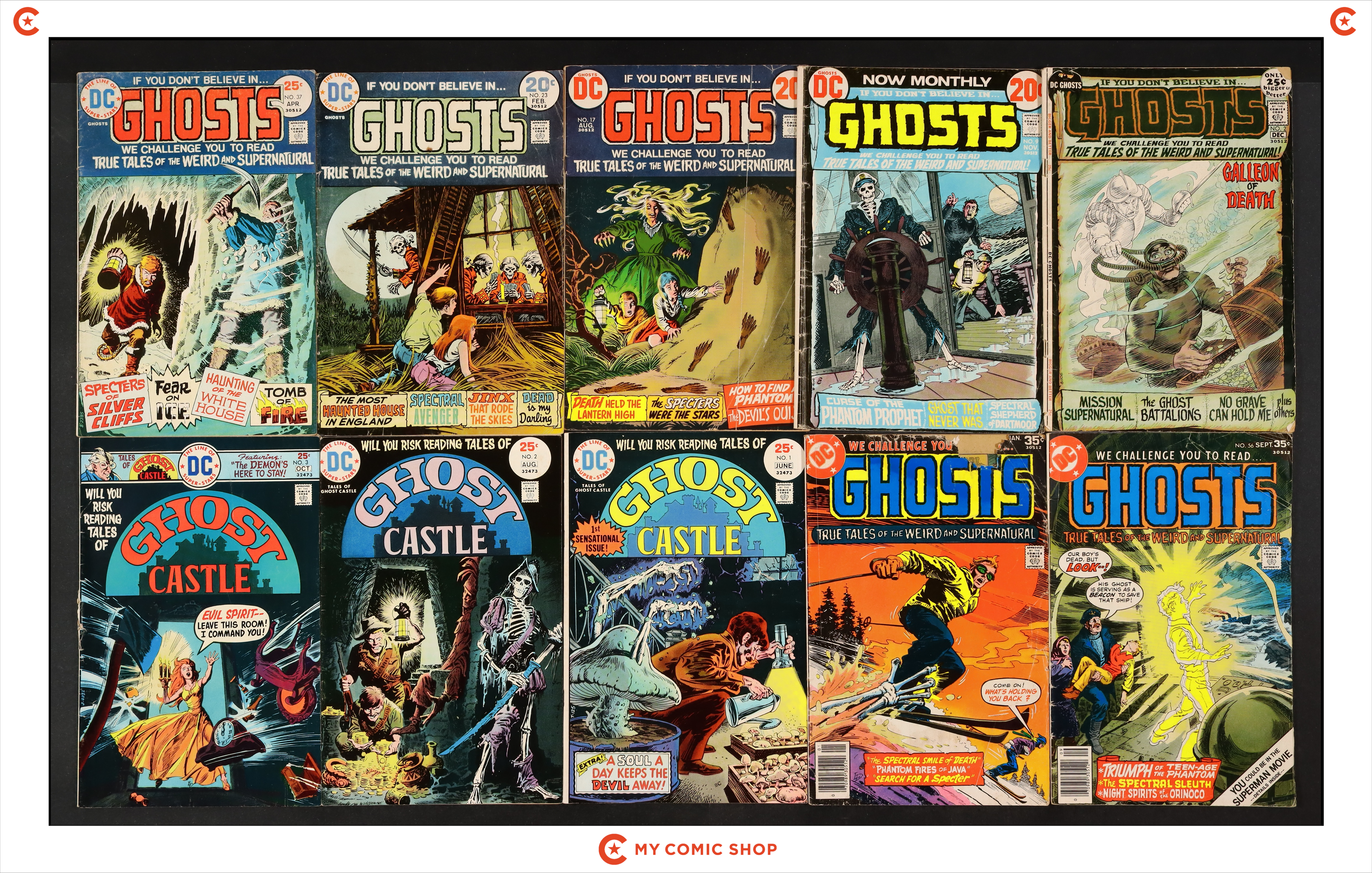 Issues 2, 9, 17, 23, 37, 56, 60 of Ghosts (1971-1982 DC); and 1-3 of Tales of Ghost Castle (1975). Most will grade in the GD to VG range, with 9 (INCOMPLETE) and 60 grading at PR.