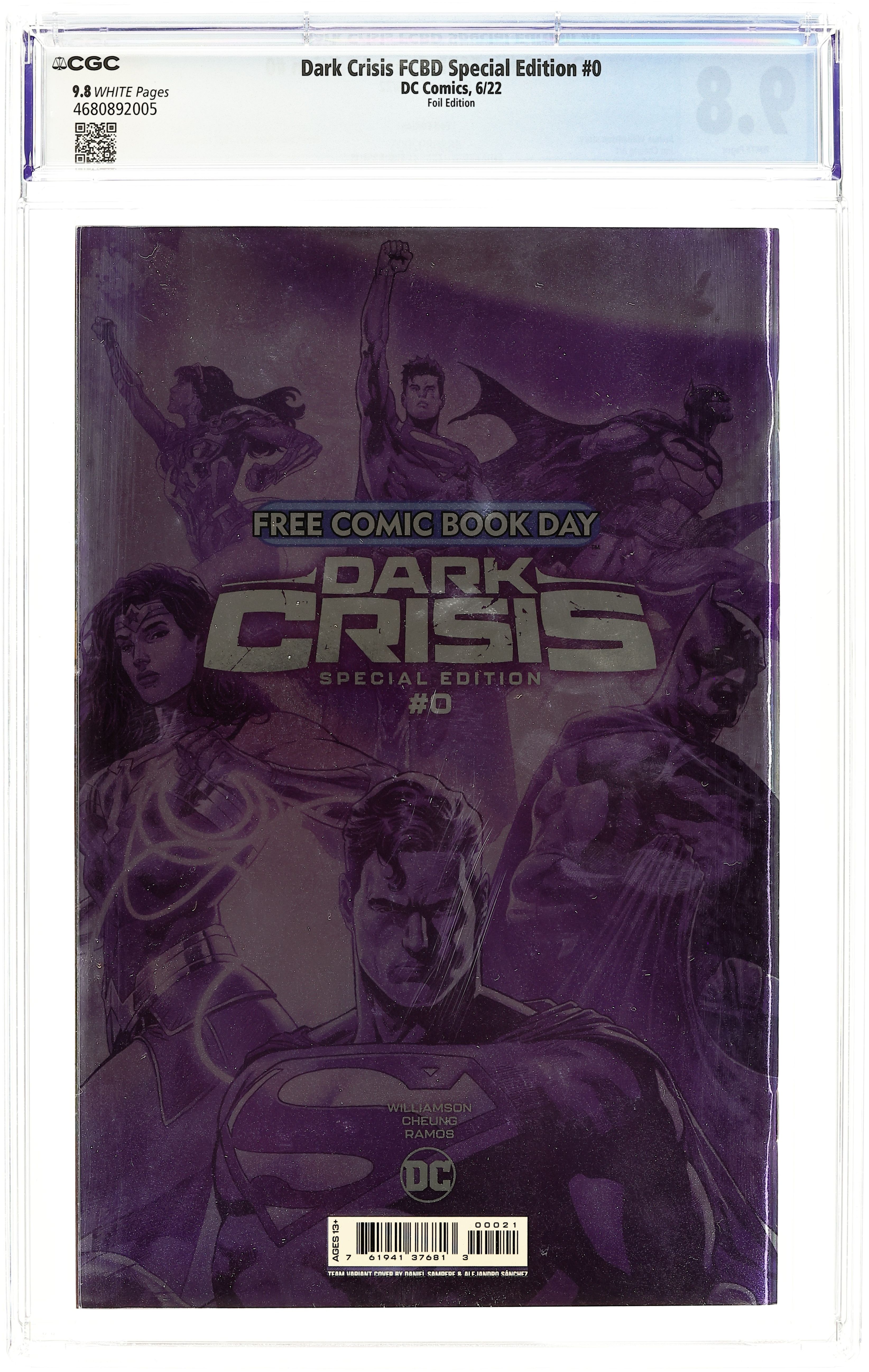 Starts Apr 4 Foil Edition. Written by Joshua Williamson and Dennis Culver. Art by Jim Cheung, Chris Burnham, Rafa Sandoval and Daniel Sampere. Cover by Daniel Sampere. Witness the rise and fall of the Justice League! The event years in the making is here with Dark Crisis! The Justice League is comics greatest super-team—made up of DC Comics legendary heroes, they have saved the world countless times. No crisis was too much for them to handle...until now! The Justice League has been defeated by the Great Darkness and its army of DCs most dangerous enemies—now a new generation of heroes must rise to protect not only the Multiverse…but also the legacy of the DCU! A prelude to DC Comics biggest story of 2022! Includes a preview and art from Dark Crisis #1 coming, in June! Dont miss out on this Free Comic Book Day special featuring the blockbuster talents of Joshua Williamson, Jim Cheung, and Daniel Sampere! 32 pages, full color. Ages 13+
