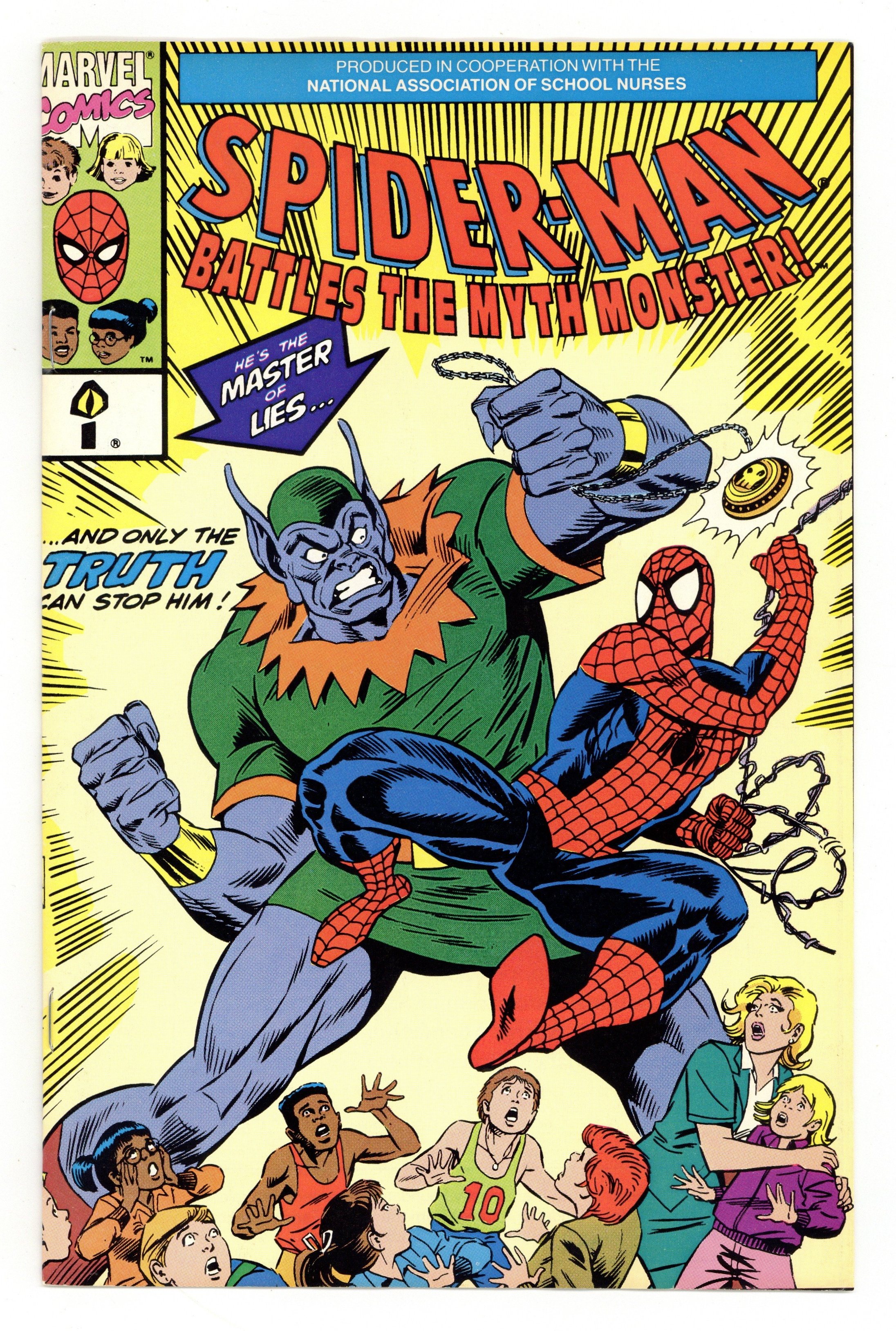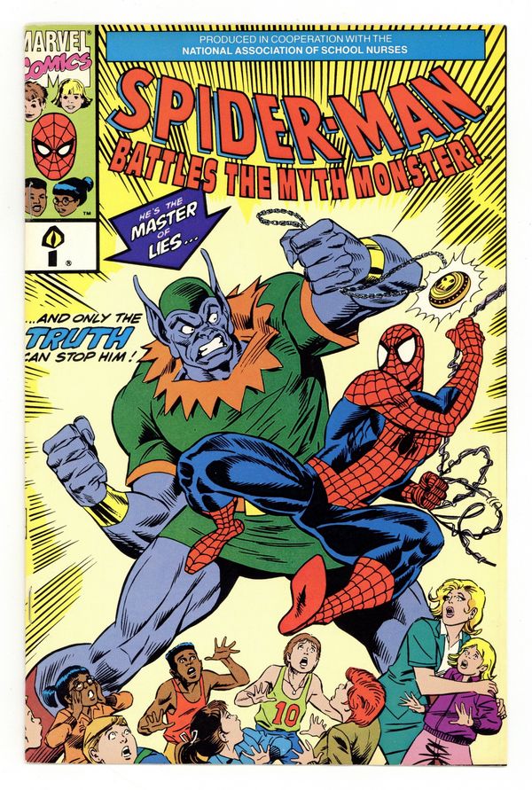Starts Apr 20 1st printing. Spider-Man Battles the Myth Monster! (1991) is a Marvel promotional comic produced in cooperation with the National Association of School Nurses. This comic is part of the Epilepsy Foundation of America Project "Count Me In!" Written by Danny Fingeroth with art by Jose Delbo and inks by Harry Candelario. Full color, standard comic dimensions, 20 pages including cover, slick cover with newsprint interior, no cover price.