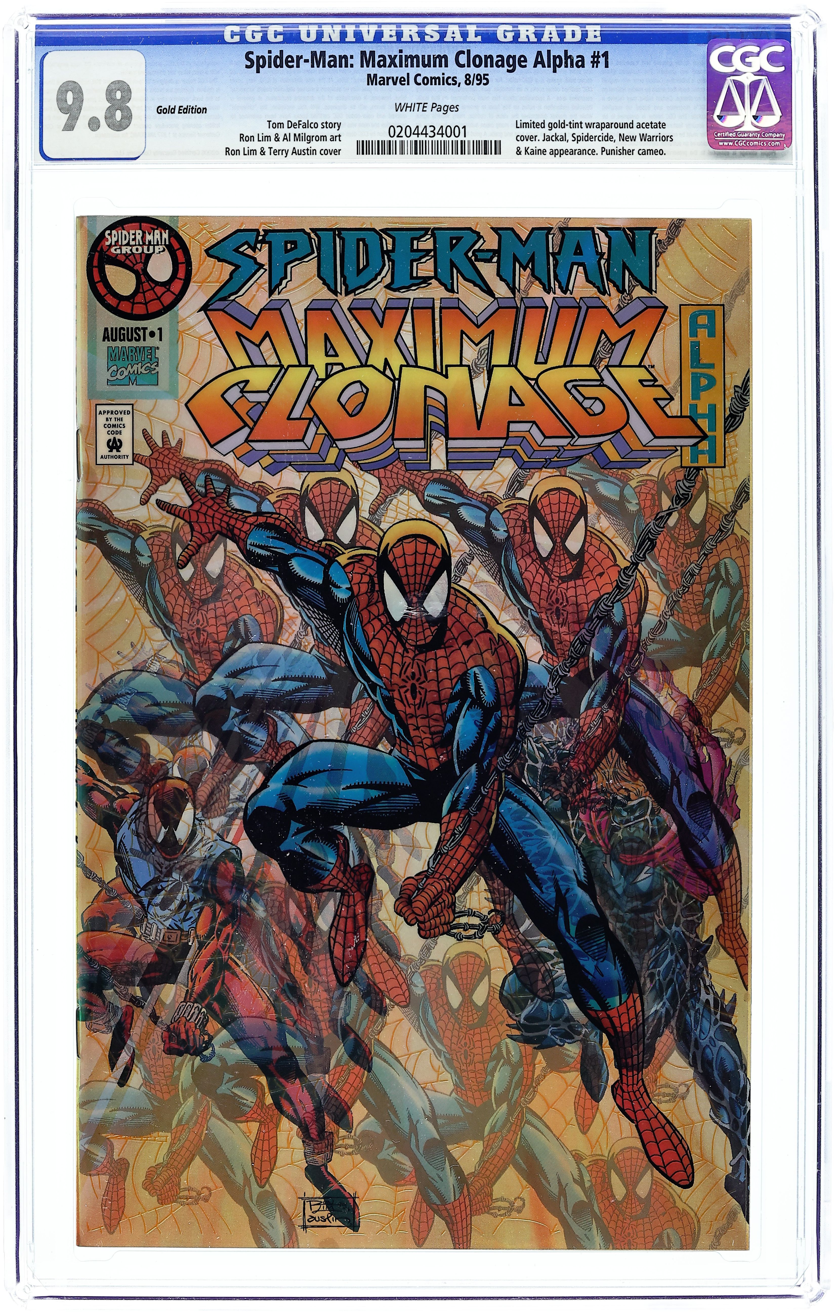 Starts Apr 4 Gold Edition Variant. 1 of 2,000. Guest-starring the New Warriors. This 48-page extravaganza stars Spider-Man, Scarlet Spider and Kaine, and reveals the Jackal's horrifying scheme! It's all been building up to this story, and it all starts here in this Alpha issue featuring an acetate cover! Continued in Web of Spider-Man (1985 1st Series) #127. Written by Tom DeFalco and Todd Dezago. Art by Ron Lim and Al Milgrom. Cover by Ron Lim and Terry Austin. NOTE: This edition has gold webbing, a gold background behind "Alpha," and a gold box on the back cover reading "One of 2000." Cover price $4.95.