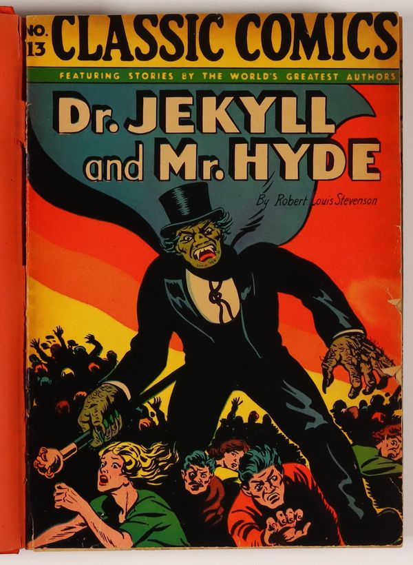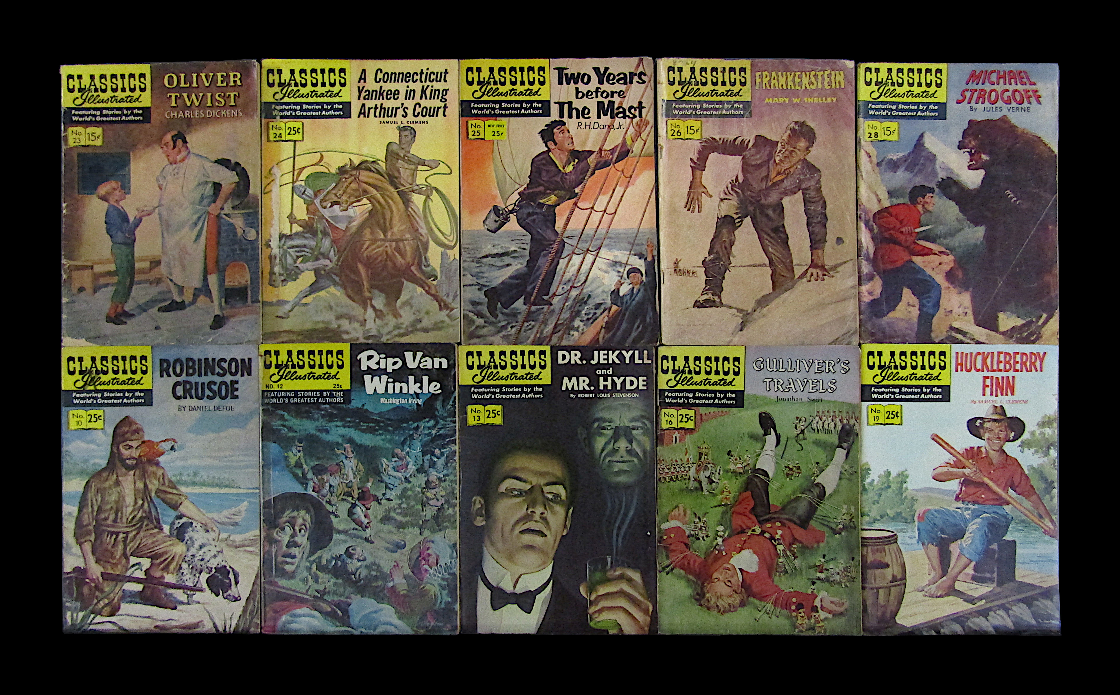 Issues 21 of Classics Illustrated 010 Robinson Crusoe (1943); Classics Illustrated 012 Rip Van Winkle 18; 16 of Classics Illustrated 013 Dr. Jekyll and Mr. Hyde (1943); 14 of Classics Illustrated 016 Gulliver's Travels (1943); 21 of Classics Illustrated 019 Huckleberry Finn (1944); Classics Illustrated 023 Oliver Twist 9; Classics Illustrated 024 A Yankee in King Arthur's Court 15; Classics Illustrated 025 Two Years Before the Mast 11; Classics Illustrated 026 Frankenstein 14; and 3 of Classics Illustrated 028 Michael Strogoff (1946). Most will grade in the GD range with a couple grading VG.