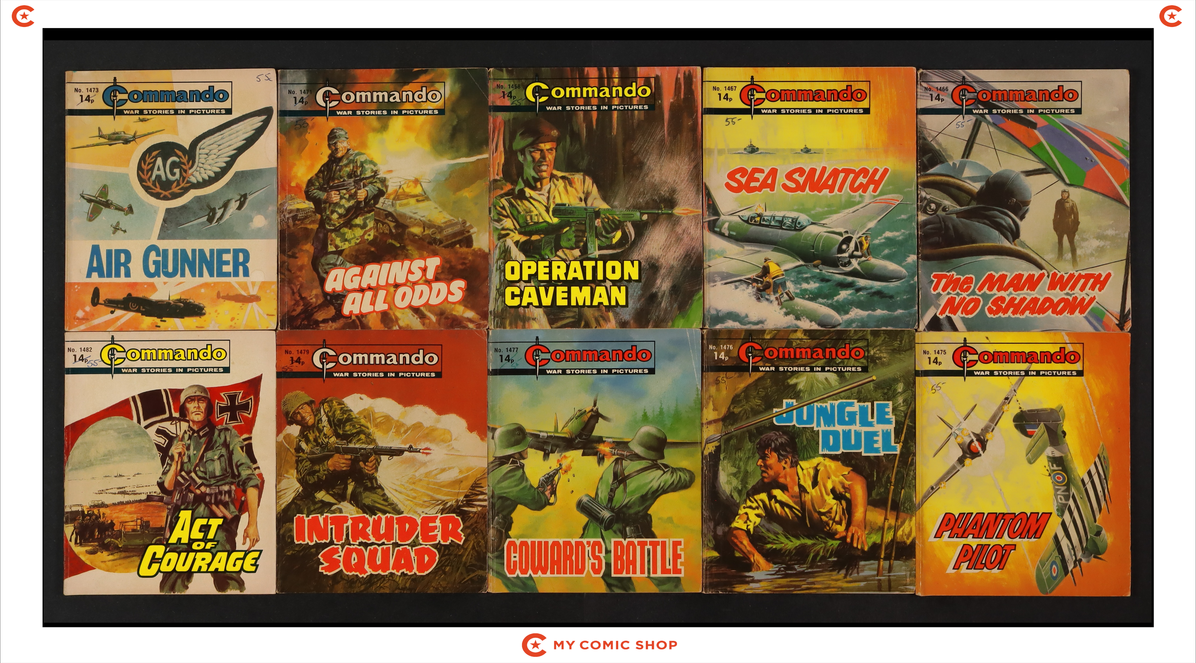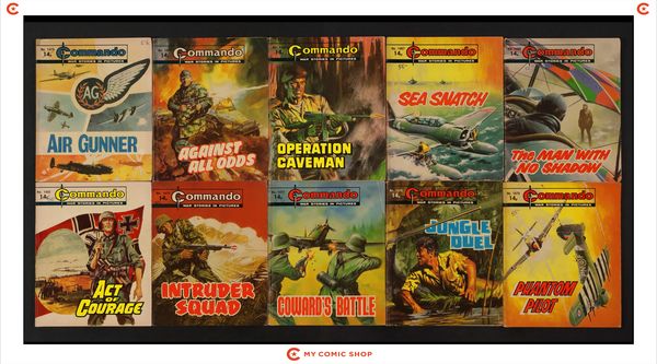 Issues 1466-1468, 1471, 1473, 1475-1477, 1479, 1482 of Commando War Stories in Pictures (1961 D. C. Thomson Digest). Most will grade in the GD/VG to VG/FN range.