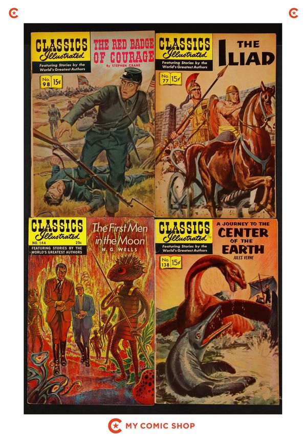 Issue 7 of Classics Illustrated 077 The Iliad (1950), issue 7 of Classics Illustrated 098 The Red Badge of Courage (1952), issue 7 of Classics Illustrated 138 Journey to the Center of the Earth, and issue 7 of Classics Illustrated 144 The First Men in the Moon (1958). Most will grade in the GD to VG range.