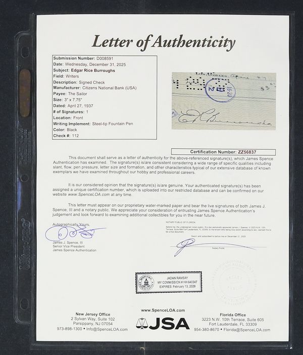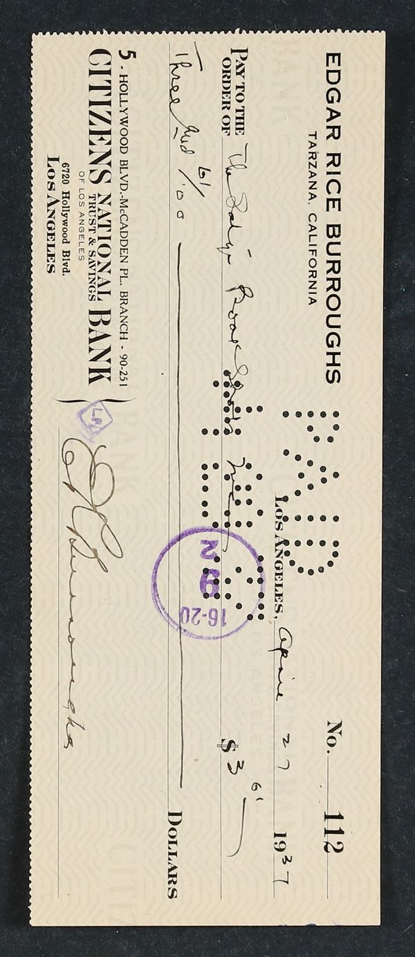 This check, written to a book shop on April 27th, 1937, was signed by Edgar Rice Burroughs himself and comes with a letter of authenticity from JSA. The $3.61 ERB paid would be an $80 book haul today! Beneath his name is printed "Tarzana, California" rather than a specific address; that neighborhood in the San Fernando Valley (so called after he purchased a plot there in 1919 and subdivided it) is still sometimes colloquially known by that name.