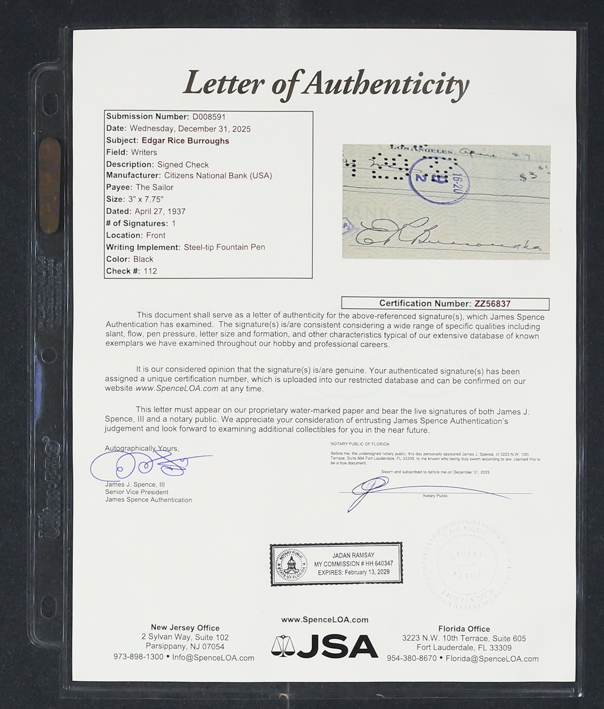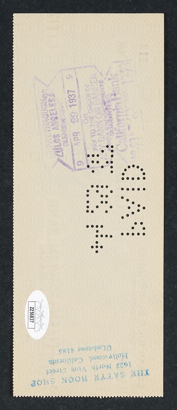 Edgar Rice Burroughs Signed CheckPublished 1937Edgar Rice Burroughs Signed Check