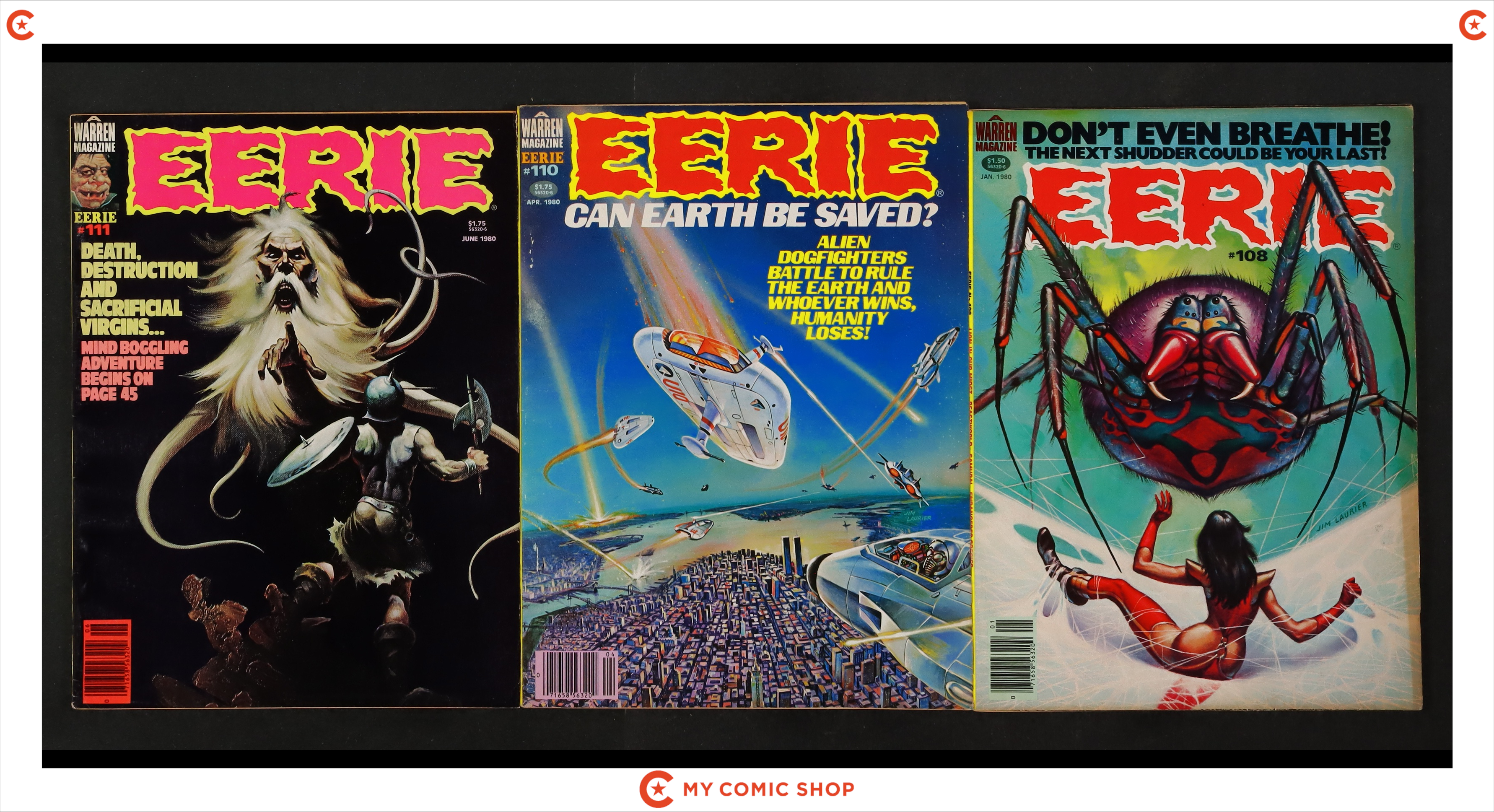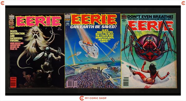 Issues 76, 80, 86, 100, 108, 110, and 111 of Eerie (1966 Warren Magazine). Most will grade in the FN to VG range.