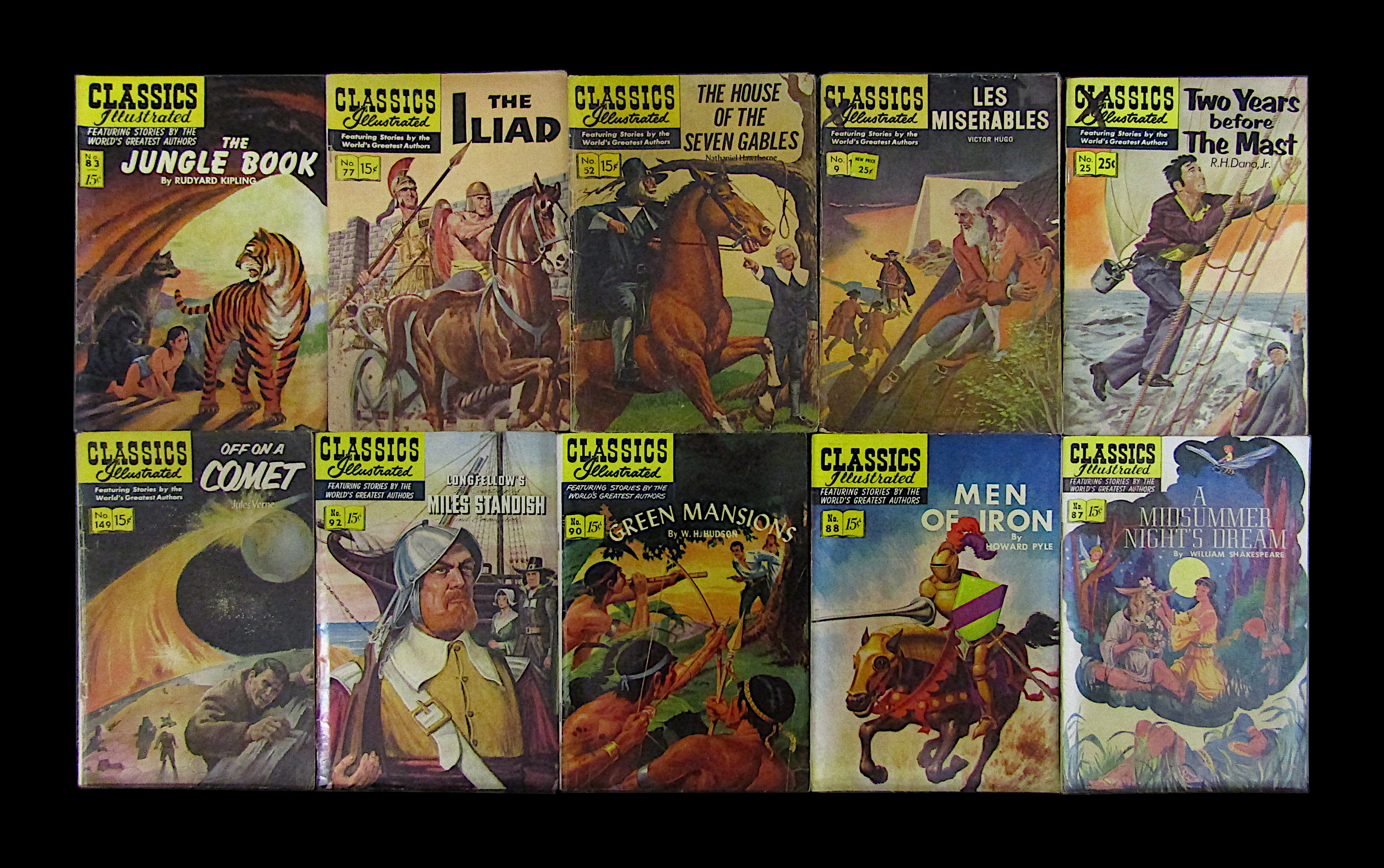 Issues 4 of Classics Illustrated 149 Off on a Comet (1959); Classics Illustrated 092 The Courtship of Miles Standish 1; 1 of Classics Illustrated 090 Green Mansions (1951); 1 of Classics Illustrated 088 Men of Iron (1951); 1 of Classics Illustrated 087 A Midsummer Night's Dream (1951); 1 of Classics Illustrated 083 The Jungle Book (1951); 8 of Classics Illustrated 077 The Iliad (1950); 4 of Classics Illustrated 052 The House of Seven Gables (1948); 11 of Classics Illustrated 009 Les Miserables; Classics Illustrated 025 Two Years Before the Mast 12. Most will grade in the VG to GD range.