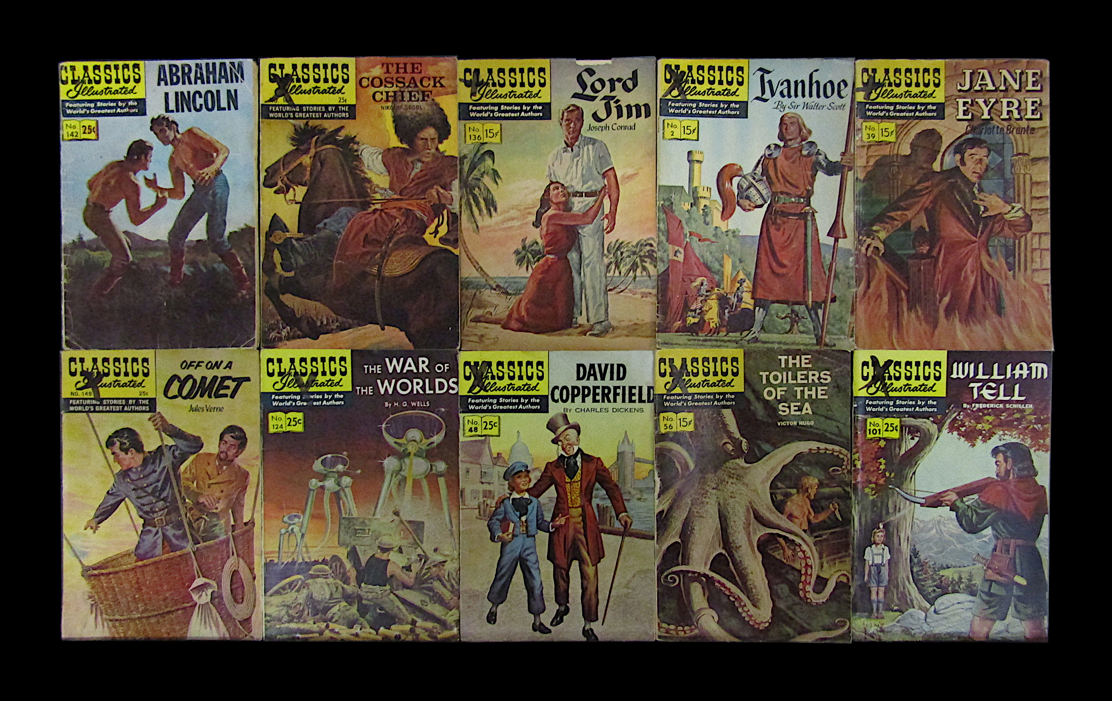 Issues 7 of Classics Illustrated 149 Off on a Comet (1959); 11 of Classics Illustrated 124 The War of the Worlds (1955); 15 of Classics Illustrated 048 David Copperfield (1965); 4 of Classics Illustrated 056 The Toilers of the Sea (1949); 8 of Classics Illustrated 101 William Tell (1952); 7 of Classics Illustrated 142 Abraham Lincoln (1958); 3 of Classics Illustrated 164 The Cossack Chief (1961); 4 of Classics Illustrated 136 Lord Jim (1957); 22A of Classics Illustrated 002 Ivanhoe (1946); and Classics Illustrated 039 Jane Eyre 12. Most will grade in the VG to GD range.