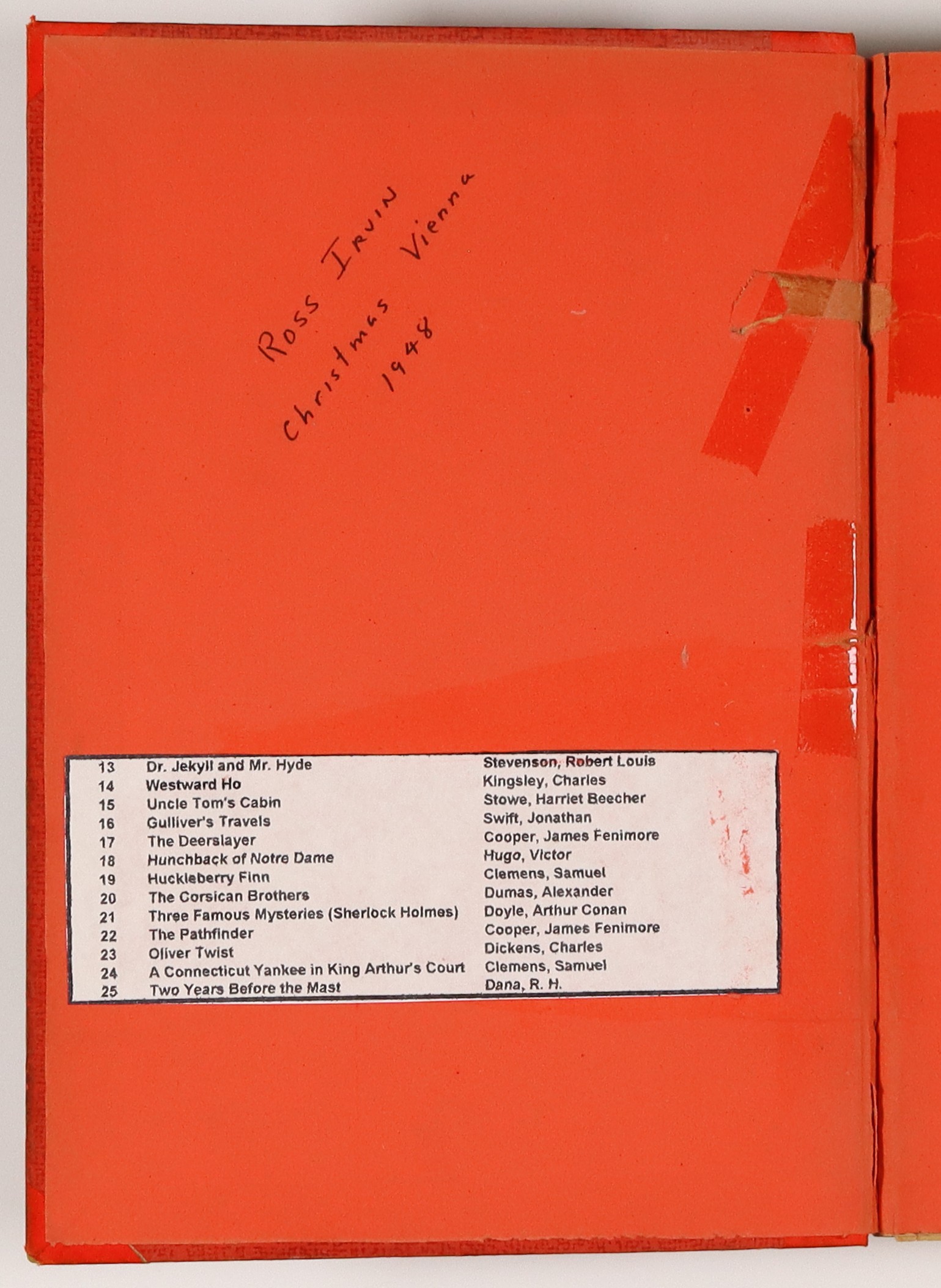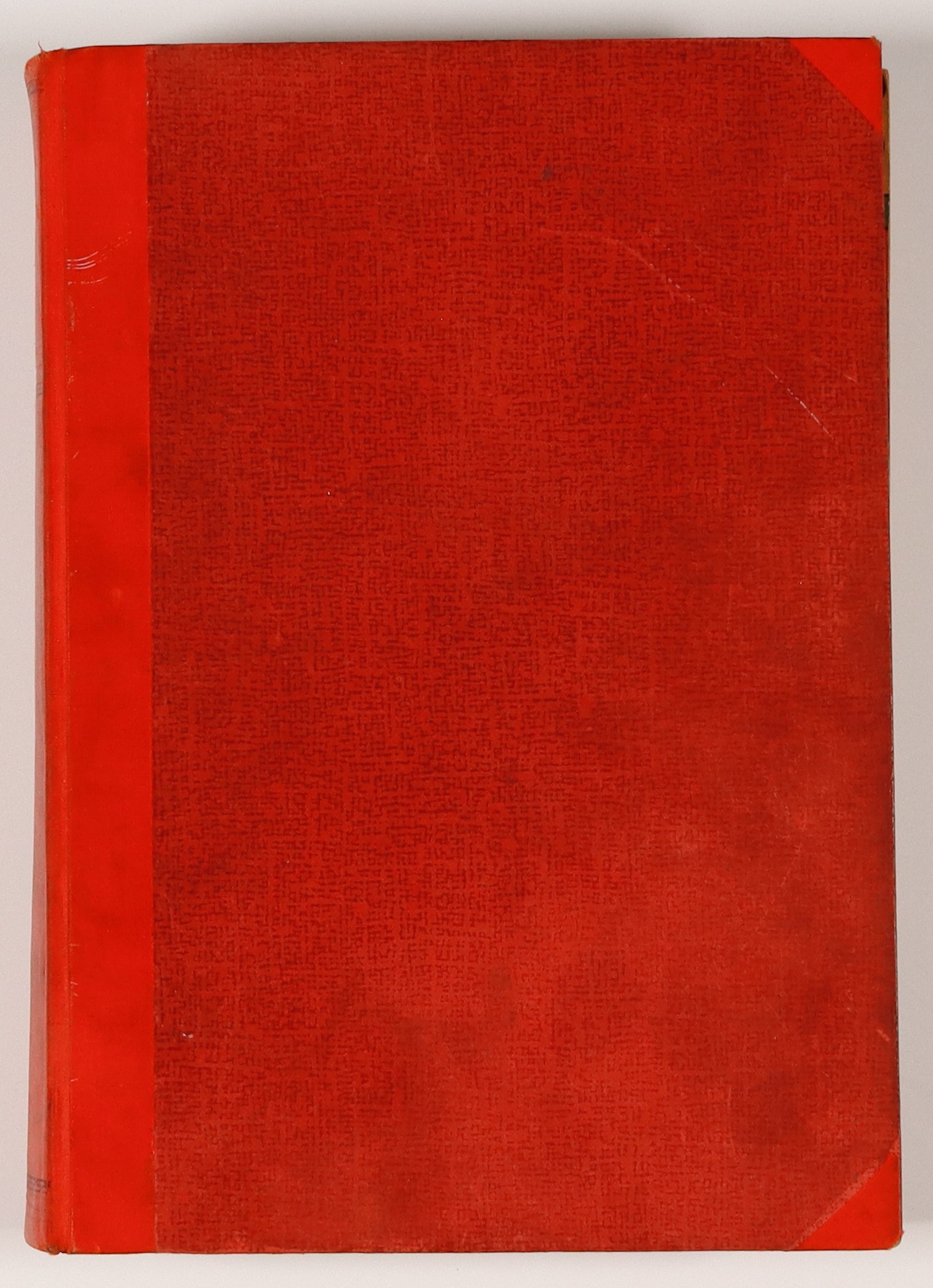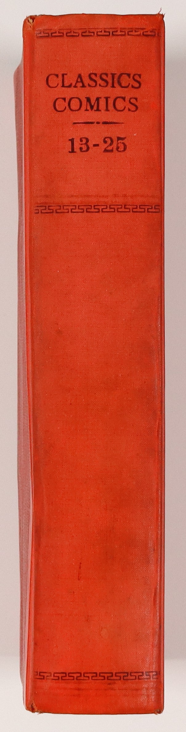 Post-manufacturer hardcover bound volume including Classics Illustrated stories 13-25, HRNs 28 and 30 (printings vary; this volume was assembled in 1948). Comics inside are trimmed for binding and grade mostly in VG range for browning/oxidation, but tape and tears are present on a few covers and one issue is missing a large piece of the back cover. Binding displays discoloration, heavy water damage, and spine damage; one leaf page torn out. Table of contents pasted to interior front cover. Outer spine labeled "Classics Comics 13-25"