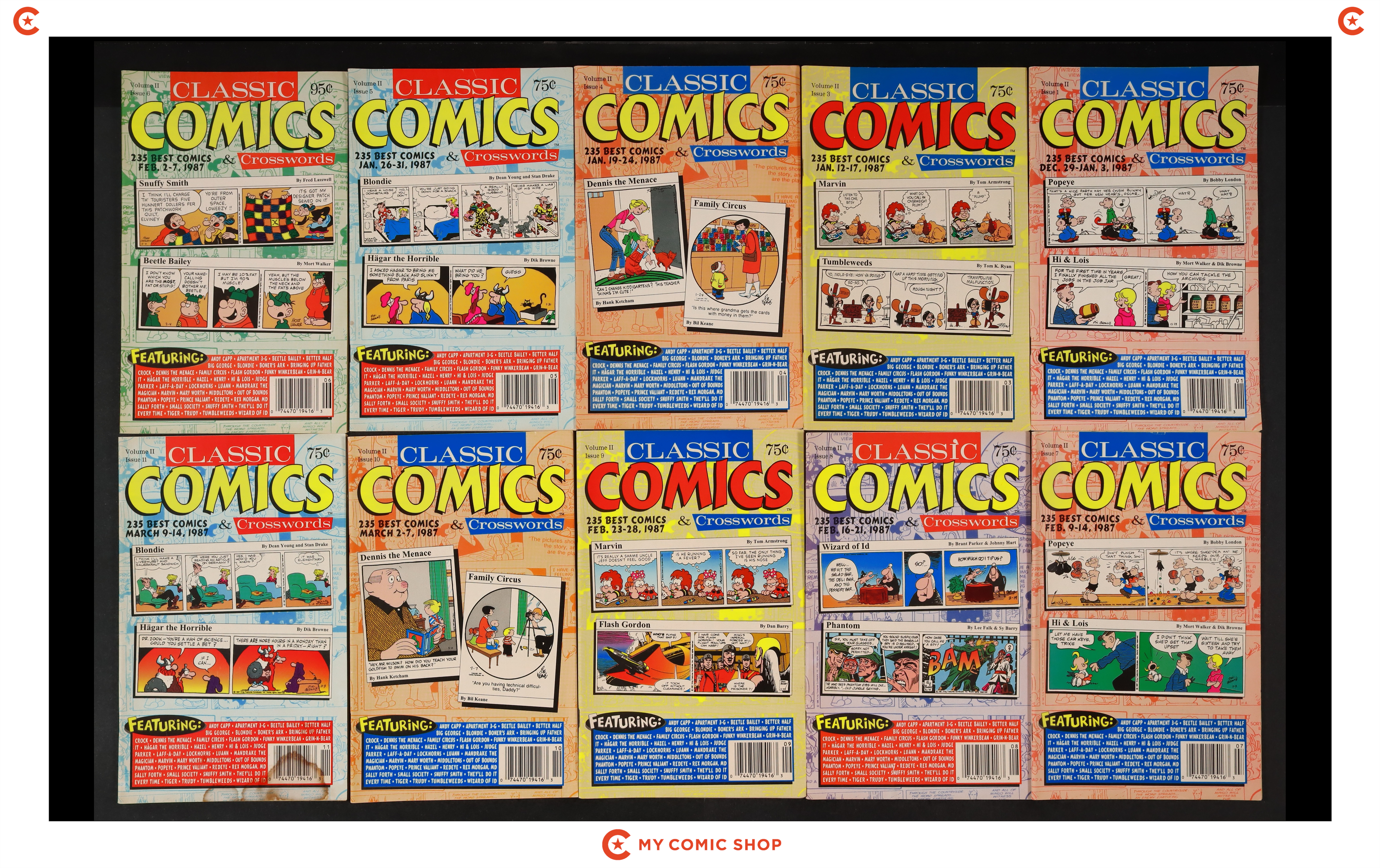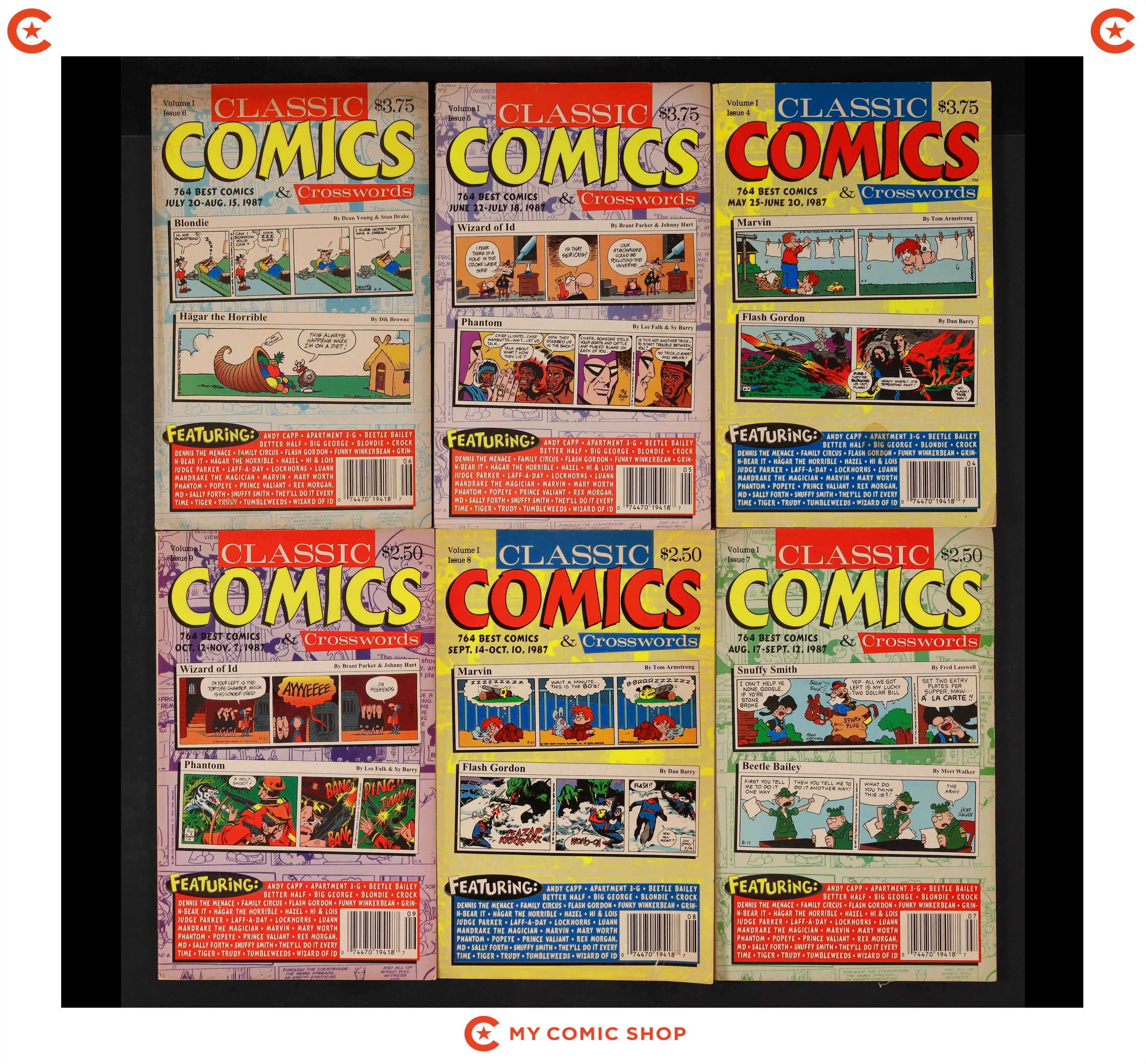 Issues Vol. 1 #4, #5C, #6, #7, #8A, and #9 of Classic Comics and Crosswords (1991 Trader Publishing Co.) Monthly. Most will grade in the FN to VG range.