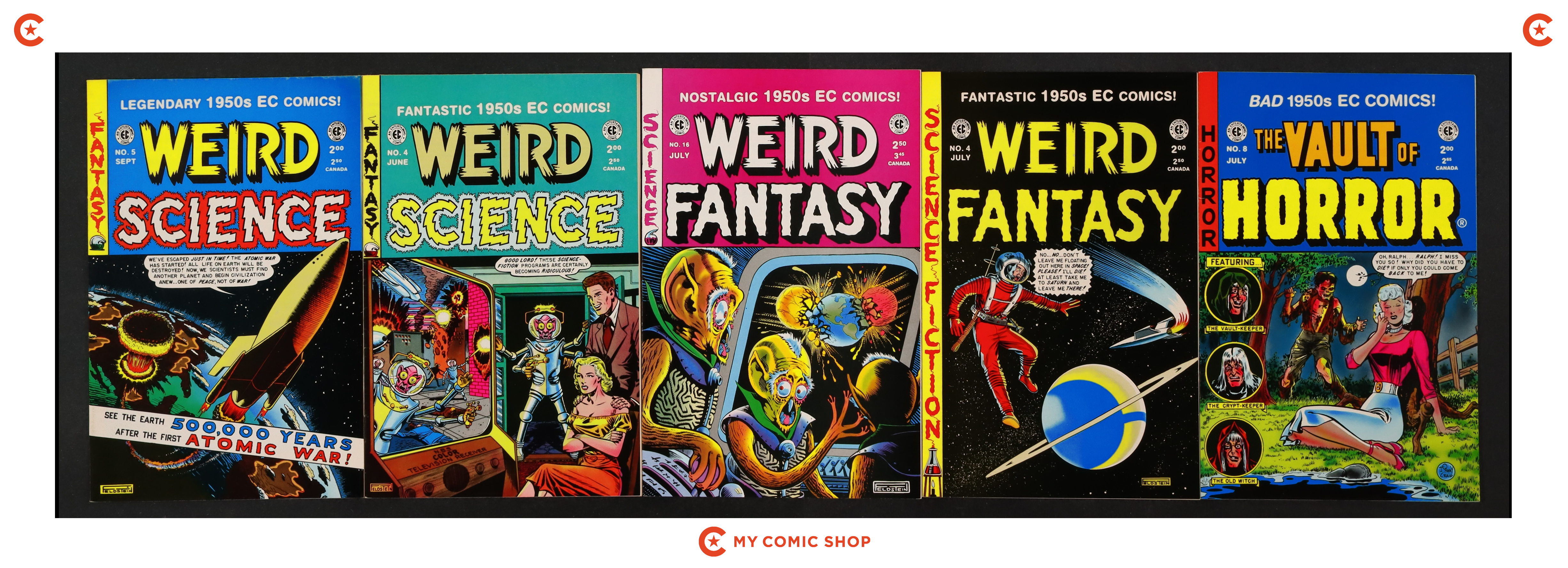 Issues 8 of Vault of Horror (1992-1999 Russ Cochran/Gemstone); 4 of Weird Fantasy (1992 Russ Cochran/Gemstone); 16 of Weird Fantasy (1992 Russ Cochran/Gemstone); 4 of Weird Science (1992 Russ Cochran/Gemstone); and 5 of Weird Science (1992 Russ Cochran/Gemstone). Most will grade in the VF to FN+ range.