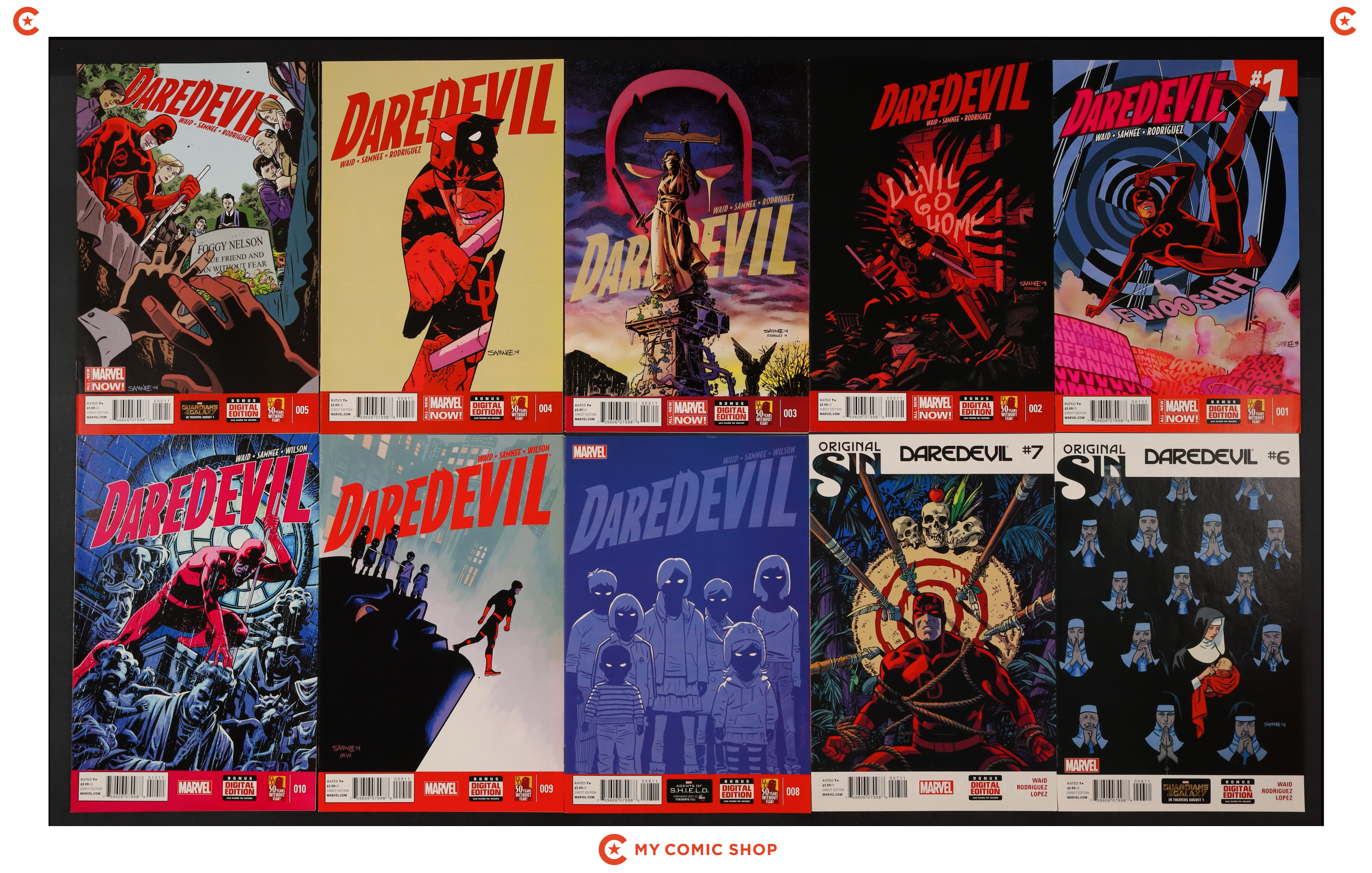 Issues 1A-3A, 4, 5, 6A, 7, 8A, 9-11, 12A, 13A, 14, 15.1A, 15A, 16A, 17, and 18 of Daredevil (2014 4th Series). Most will grade in the NM to VF range.