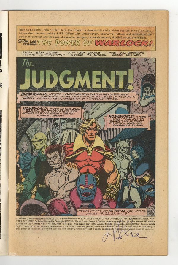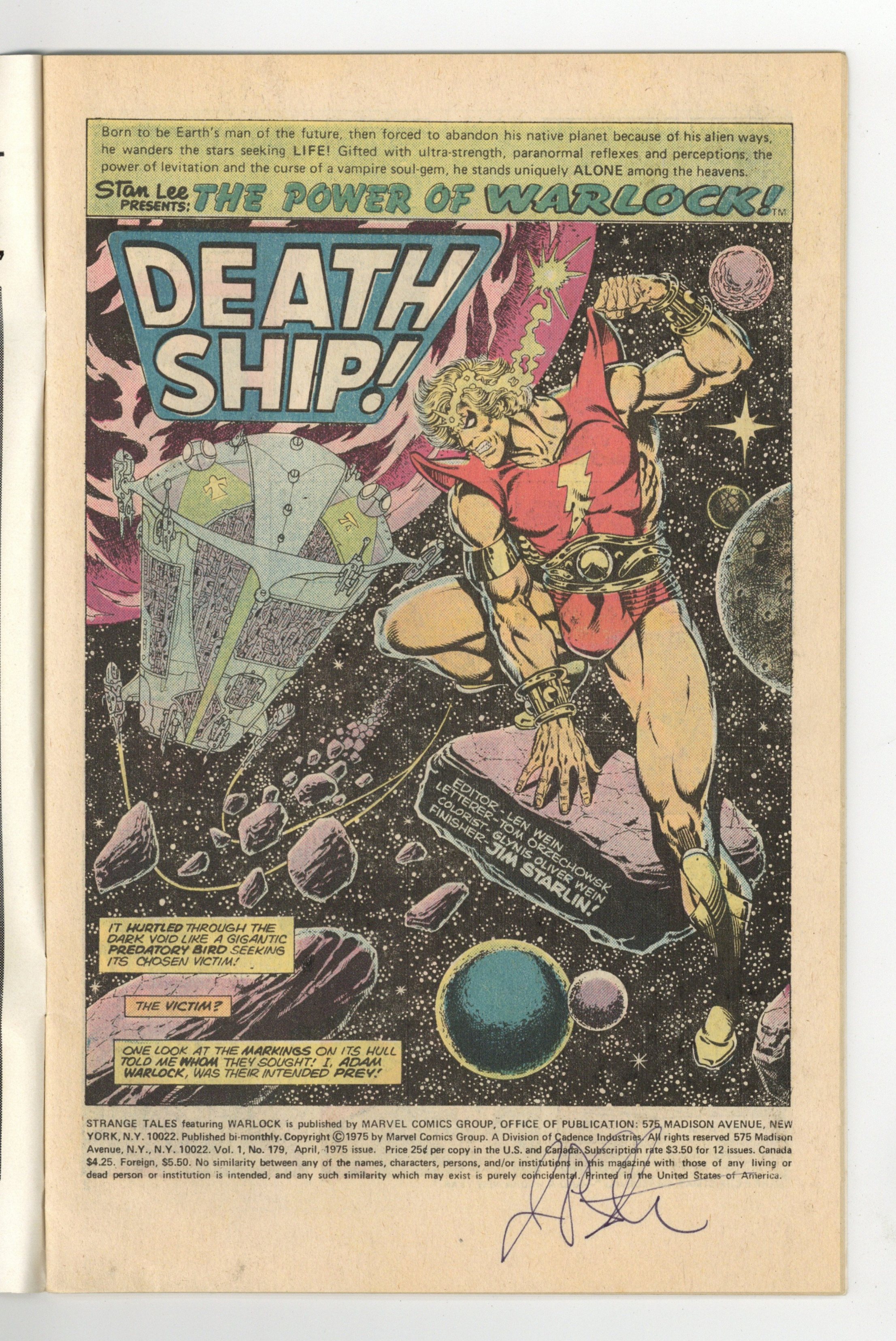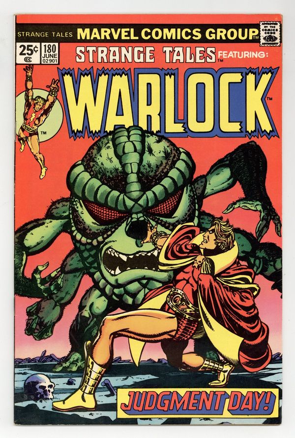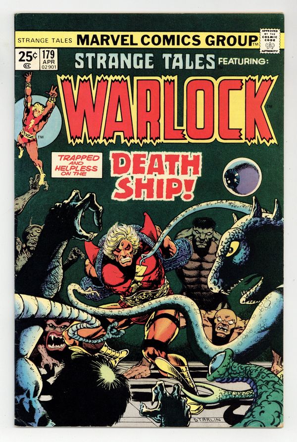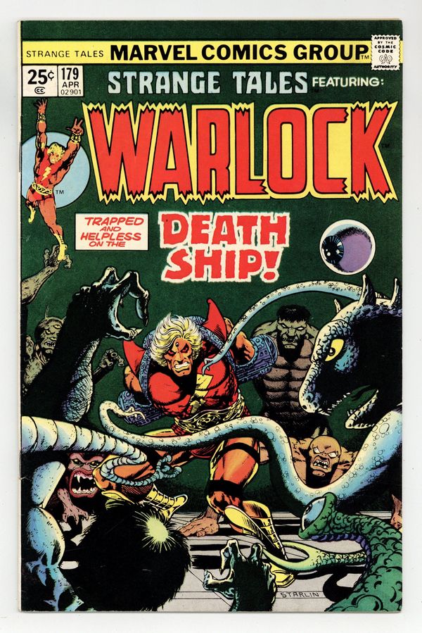 Starts Mar 23 Cover art by Jim Starlin. "Death Ship!", script and art by Jim Starlin; Warlock is captured by Autolycus of the Black Knights an brought aboard Magus' Flagship; His fellow prisoners tell Warlock, that survivors of the Wars of the Church are taken as slave laborers, those who refuse will be terminated and their remains will be chemically broken down and valuable elements that can be retrieved will be used to further the cause of the Church; They also tell him, that Non-Humanoids are not considered fashioned in the Magus' image and thus must be disposed of, this also holds true for some Humanoid types—such as Trolls; First appearance of Pip the Troll. 36 pgs., full color. Cover price $0.25.