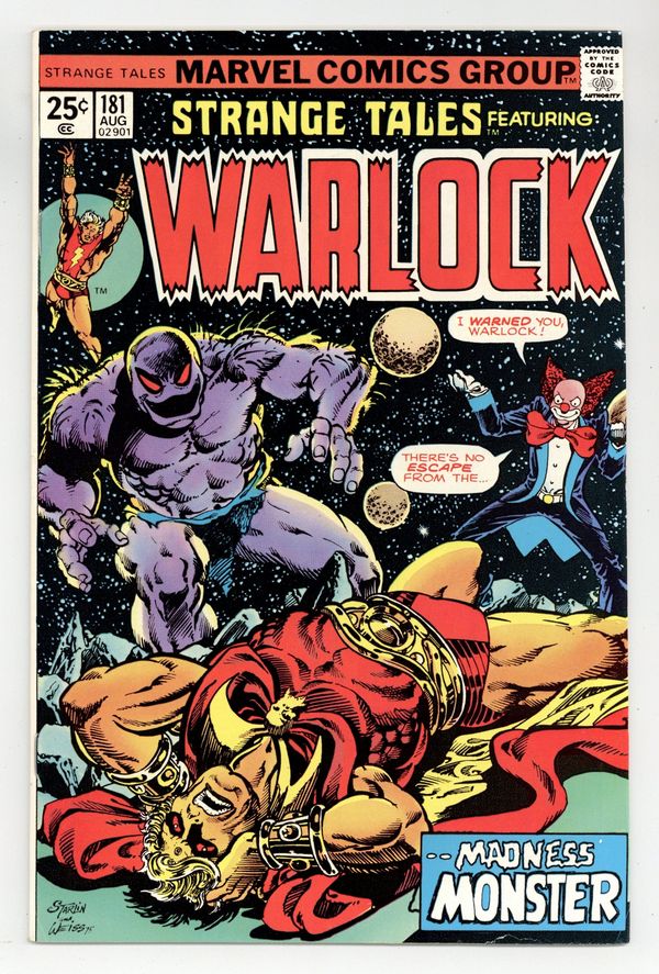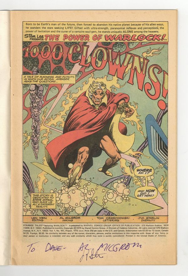 Starts Mar 23 Cover pencils by Jim Starlin, inks by Alan Weiss. "1000 Clowns!", script and pencils by Jim Starlin, inks by Al Milgrom; Warlock finds himself in a strange place and considers, that this is just an illusion but decides, that he is in a Reality unlike any he has ever seen before, the Head Clown states, that Warlock has always been in this Reality, he has just never seen it in quite this manner before and calls it the "Land of the Way it was"; A Technician states that something is wrong with visual and audio programming; The Clowns are trying to reprogram Warlock and Beautiful Jan paints a Clown's Mask on Warlock's Face because all the dark aspects have to go; Gamora and Pip the Troll are on their way to rescue Warlock and interrogate one of the Black Knights, and he is scared to death by Gamora; Len takes Warlock to a Renegade Clown who is being punished. Hulk comic book ad. The story continues in Warlock 9. Captain Marvel stars in a one-page Hostess ad, "The Big Bang!" 36 pgs., full color. Cover price $0.25.