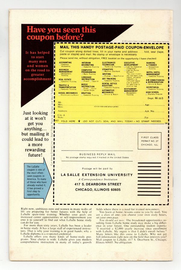 Starts Mar 23 Cover art by Jim Steranko. Nick Fury stars in "Armageddon!", script and pencils by Jim Steranko, inks by Joe Sinnott; While Jimmy Woo cradles the body of Suwan in his arms a SHIELD Suicide Squad bursts in via The Dreadnought, a colossal tunneling machine; The Claw vanishes but Fury uses a Pseudo-Elliptoid Wrist Tracer to find him, but arrives just as the villain escapes into the Space-Time Continuum in an Infinity Sphere; Fury finds a Prototype Warp-Vest and follows The Yellow Claw as they have a psychic duel. "This Dream—This Doom!", script by Dennis O'Neil and Dan Adkins (co-plot), art by Dan Adkins; The Ancient One is alive and tells Strange he made Zom believe he was dead so he could pass on his powers to his disciple; With the Cosmic Balance restored he was able to shatter the spell that bound him; In his Himalayan retreat Strange and the Ancient One discover that Victoria Bentley is a prisoner in the Dimension of Dreams; Using a mystic gem and with his mentor to mentally guide him Strange travels to Victoria. Ad for Not Brand Echh and Daredevil. Statement of ownership--average print run 428.603; average paid circulation 241,561. 36 pgs., full color. Cover price $0.12.