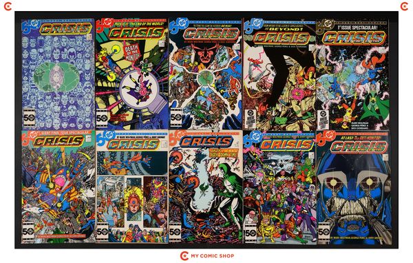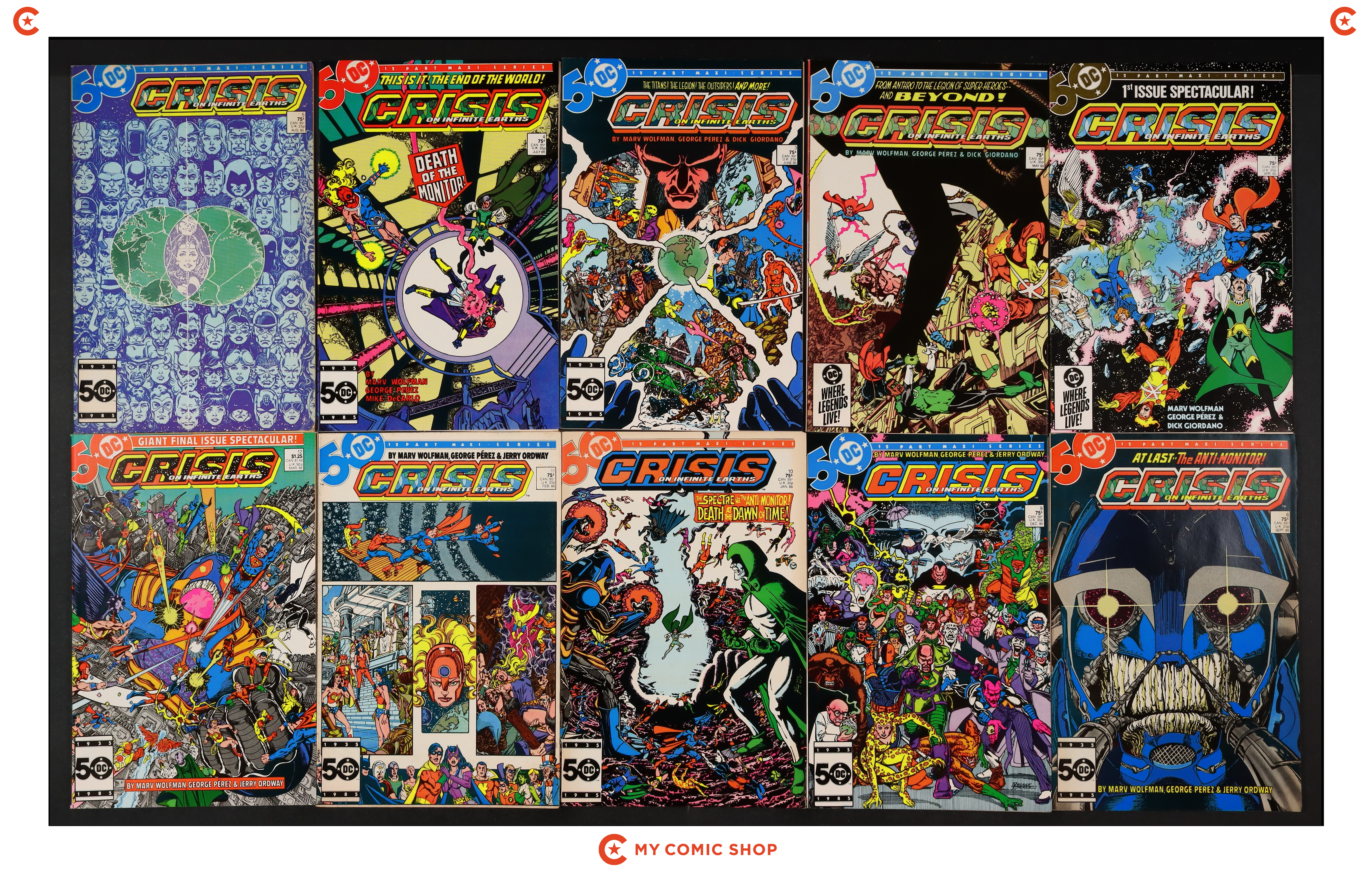 Issues 1-6 and 9-12 of Crisis on Infinite Earths (1985). Most will grade in the FN range with a couple grading VF.