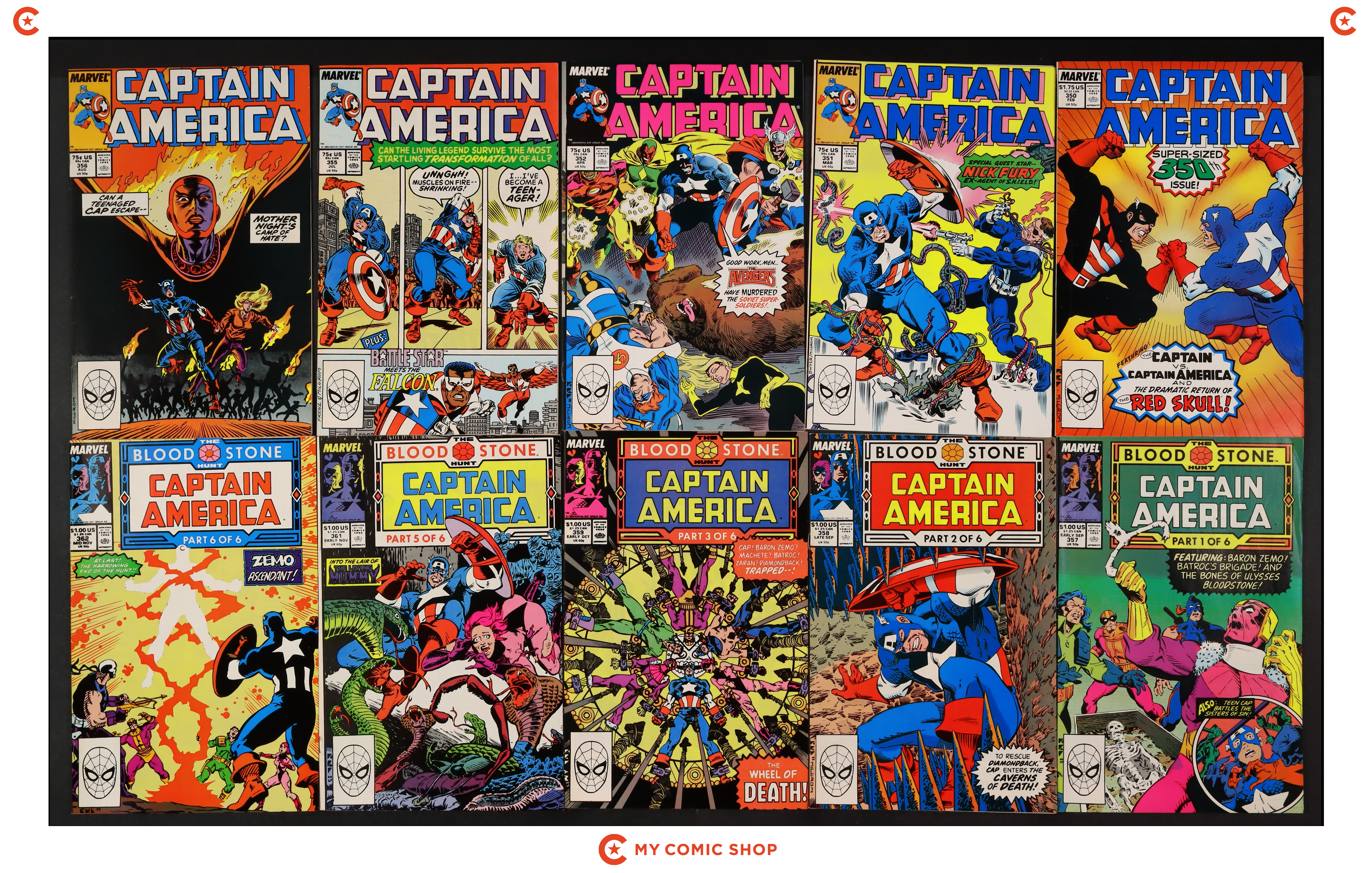 Issues 382, 383N, 387, 388, 392-394, and 396-398 of Captain America (1968 1st Series). Most will grade in the VF- to FN range with a couple grading VG.