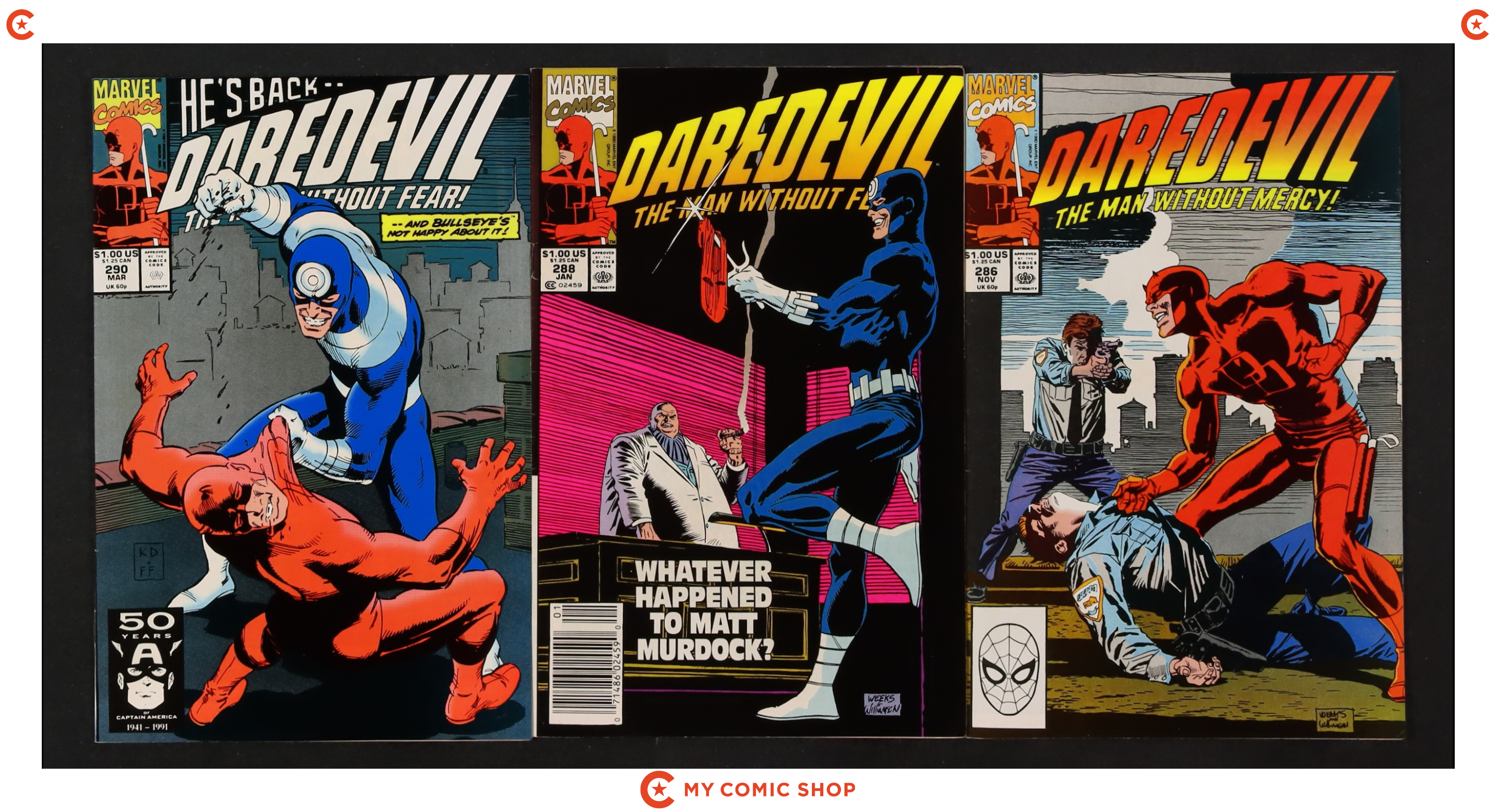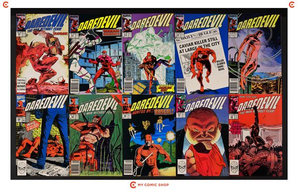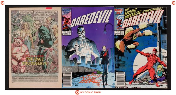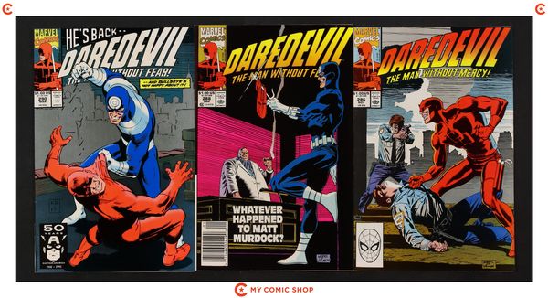 Matt returns to New York on business, makes a new friend, then sets out to stop one of the Kingpin's operations. Part 4 of 5. Script by Frank Miller, pencils by John Romita Jr., inks by Al Williamson. 1-page Kingpin pin-up by Romita Jr. and Williamson. 4-page introduction (illustrated with panels from past issues of Man Without Fear) by Frank Miller. 27 pages of story. Romita Jr./Williamson cover. Red foil and embossing on cover. Cover price $2.95.