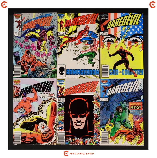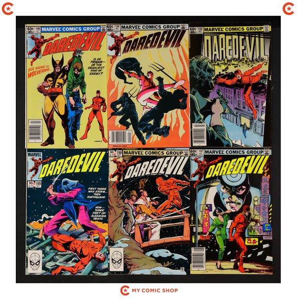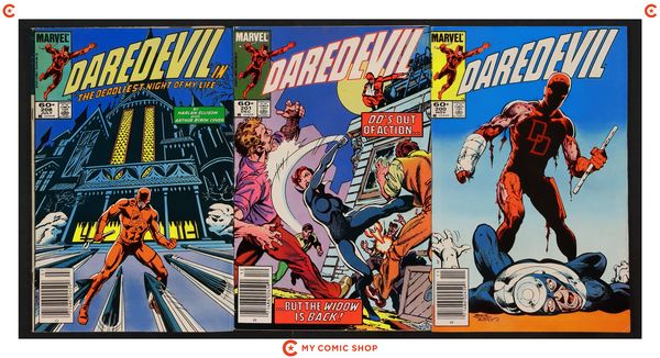 Mark Jewelers Advertisement Insert Variant. Daredevil doesn't believe that Elektra is dead in "She's Alive." Script and breakdowns by Frank Miller, finished art by Klaus Janson. Brief appearances by the Kingpin and the Punisher. Miller/Janson cover. Cover price $0.60.