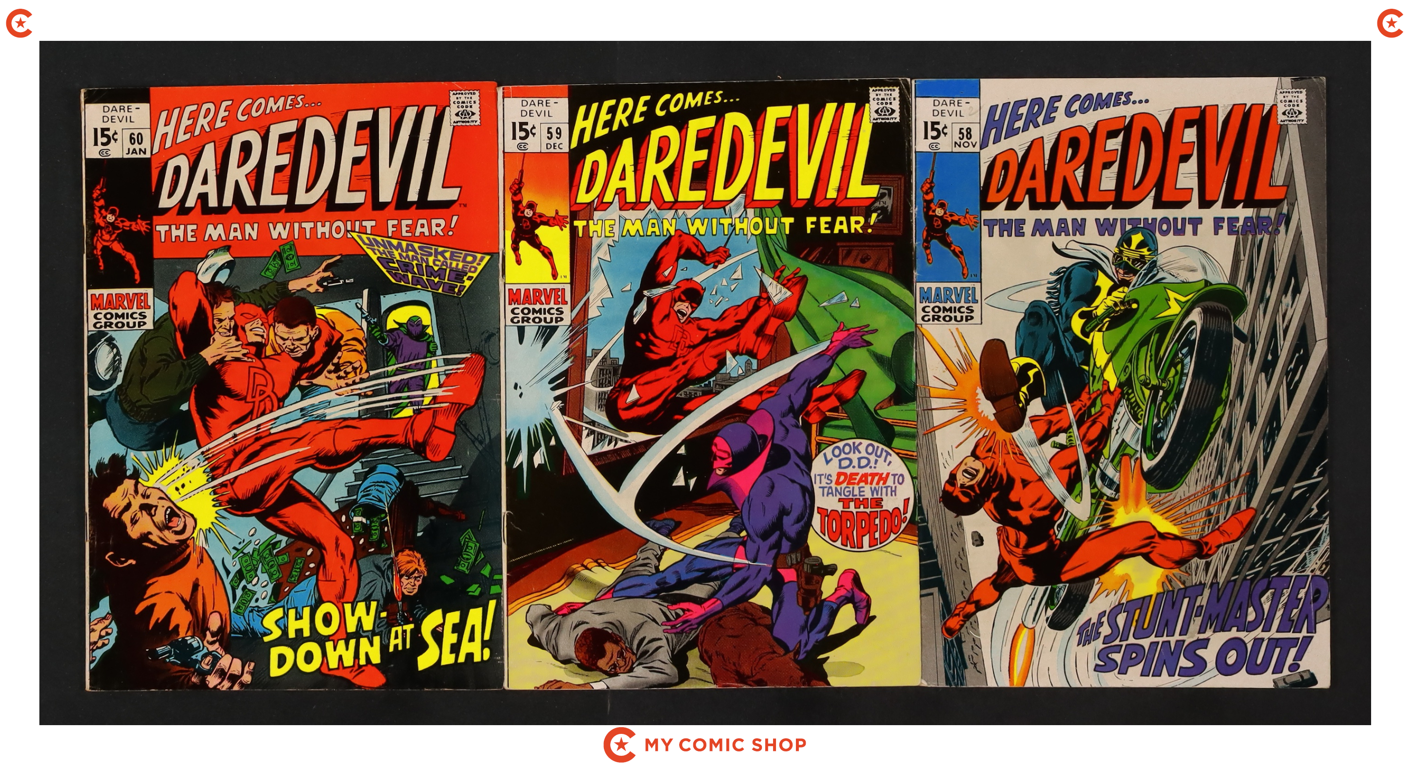 64-page all-new giant-size issue (no reprints). "Electro and the Emmisaries of Evil!" Script by Stan Lee, pencils by Gene Colan, inks by John Tartaglione. Back-up features inclue "Inside Daredevil" (2 pages of "far-out facts"), "An Explanation" (two pages about Mike Murdock), "Blueprint for an All-Purpose Billy Club" (one page), "At the Stroke of Midnight" (three pages showing Lee and Colan in a story conference), and pin-ups of Karen Page, Foggy Nelson, Ka-Zar, Daredevil, the Gladiator, the Leap-Frog, the Owl, and the Masked Marauder.. Colan/Frank Giacoia cover. Cover price $0.25.