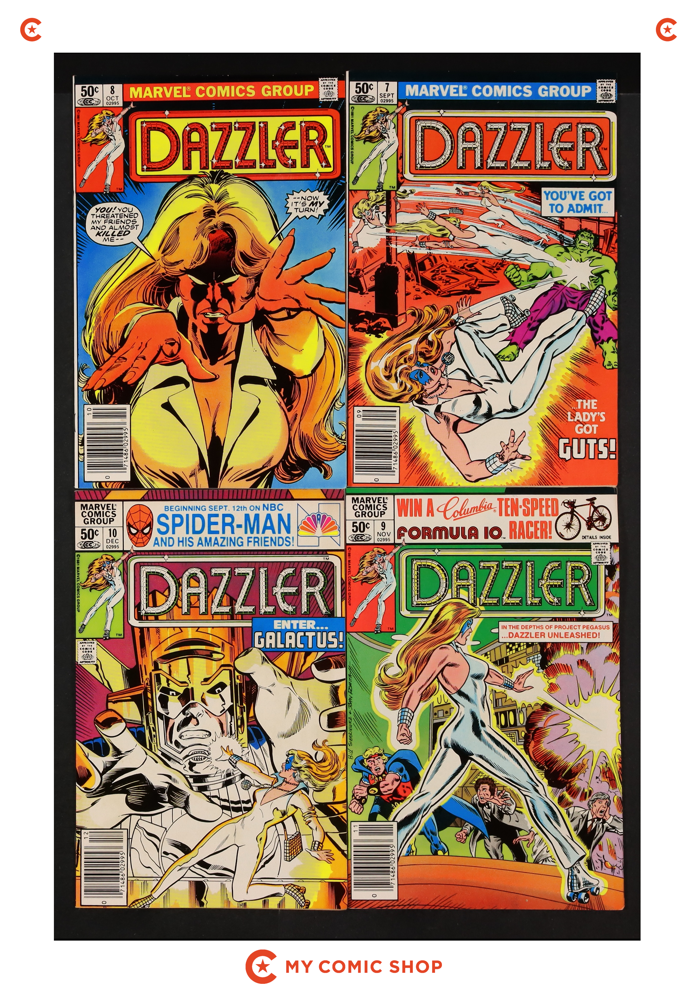 Issues 7N, 8N, 9, 10 of Dazzler (1981). Most will grade in the VG to FN range.