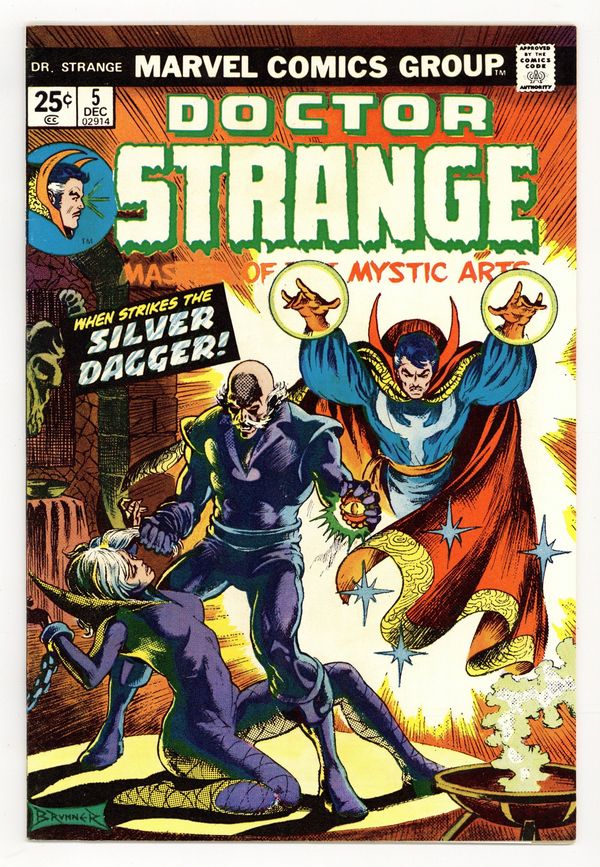 Starts Jan 3 Cover art by Frank Brunner. ...Where Bound'ries...Decay, script by Steve Englehart (co-plot, script) and Frank Brunner (co-plot), pencils by Frank Brunner, inks by Dick Giordano and Bob Wiacek [as Crusty Bunkers]; Strange confronts Death, takes refuge inside form of Eternity. Strange fears Death no longer, & he Dies!!; Strange beholds Ancient One, who tells Strange he has won first in series of trials as Sorcerer Supreme; Ankh appears on Strange's forehead; Appearances by Clea, Eternity, and the Silver Dagger. The letters page contains Marvel Value Stamp series A #33 (Sue Richards, Invisible Girl; Jack Kirby art?). Cover price $0.25.