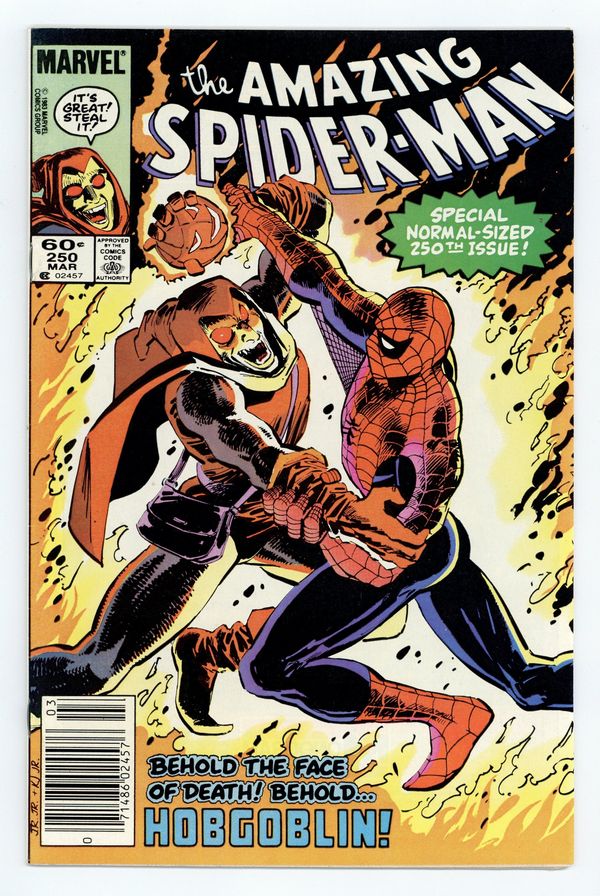 Starts May 11 IMPORTANT: Issue 238B DOES NOT come with Lakeside Skin Tattooz (insert may be present, but tattoo is missing either way). Direct Edition. First appearance of the Hobgoblin in "Shadow of Evils Past!" Script by Roger Stern. Art by John Romita Jr. (breakdowns) and John Romita Sr. (finishes). Cover by John Romita Jr. and John Romita Sr. One of the landmark issues of the Amazing Spider-Man! And the beginning of the long secret identity mystery of the Hobgoblin! After escaping from the web-slinger, a bank robber stumbles upon an underground hideout of the (deceased) Green Goblin! Not knowing what to do with his discovery, the small-time hood shows the secret lair to an underworld associate! Unfortunately for the wondrous wall-crawler, the devious associate knows exactly what to do: resurrect the Green Goblin...with a twist! And a short time later a new super-villain is born! The Hobgoblin! Cameo appearance by Mary Jane Watson. Flashback cameo by Norman Osborn (aka the Green Goblin). (Notes: The secret identity of the original Hobgoblin takes many twists and turns over the next decade. Who actually operates as the Hobgoblin in this issue is revealed in the Spider-Man: Hobgoblin Lives (1997) Limited Series (written by Roger Stern). This issue was reprinted in Marvel Tales 257 and also in the 1992 trade paperback: the Amazing Spider-Man -- Origin of the Hobgoblin.) 36 pages. Cover price $0.60.