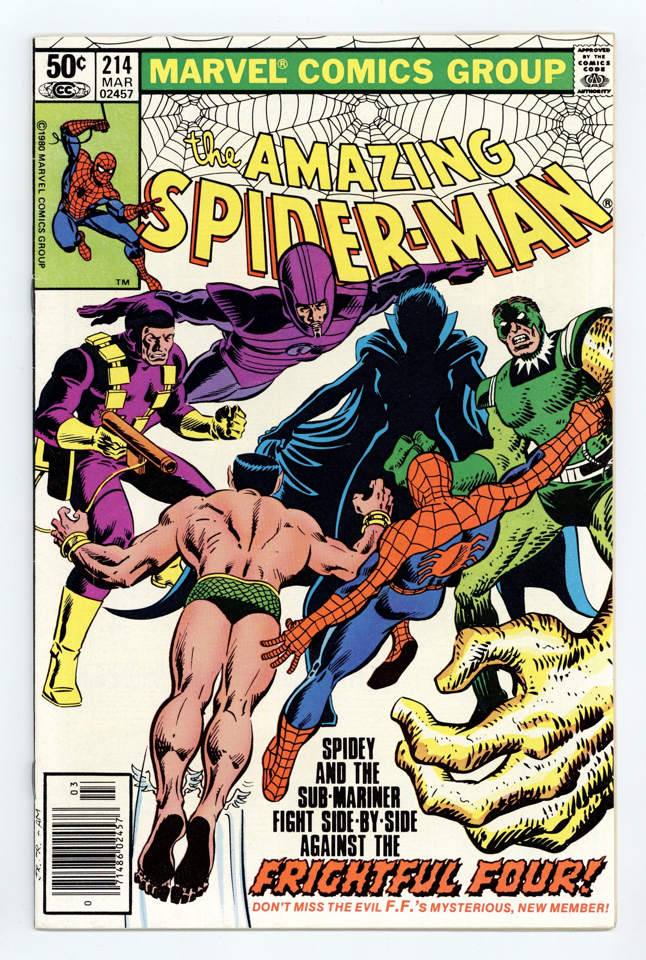 Starts May 18 Newsstand Edition. "Then Shall We Both Be Betrayed!" Part 2 of 3. Guest-starring the Sub-Mariner. Script by Denny O'Neil. Art by John Romita Jr. (breakdowns) and Jim Mooney (finishes). Cover by John Romita Jr. and Al Milgrom. After torching Peter Parker's Chelsea apartment, the Wizard and Llyra go back to Ryker's Island and free the Sandman and the Trapster! And just like that the Frightful Four is together again! Meanwhile in midtown, a tired web-slinger (and his fellow tenants) check into a nice hotel following their narrow escape from their burning building last issue. But out of the blue the Sub-Mariner smashes into one of the adjoining rooms and threatens Peter's attractive neighbor! Aunt May's nephew is furious! Are Spider-Man and the Avenging Son going to throw down again? Why yes they are! And the winner gets...the Frightful Four! (Notes: Llyra previously appeared in Sub-Mariner (1st series) 50. This issue includes a bizarre full-page parody of the cover to the classic Uncanny X-Men 142 (by Jim Salicrup and Terry Austin). The Sentinel on the cover says: "Hi kids! We're back again! And we've killed all the X-Men! Really! 'Cept Kitty, and she's real small." It's believed that Amazing Spider-Man 214 was the only issue that featured this special advertisement.) 36 pages. Cover price $0.50.