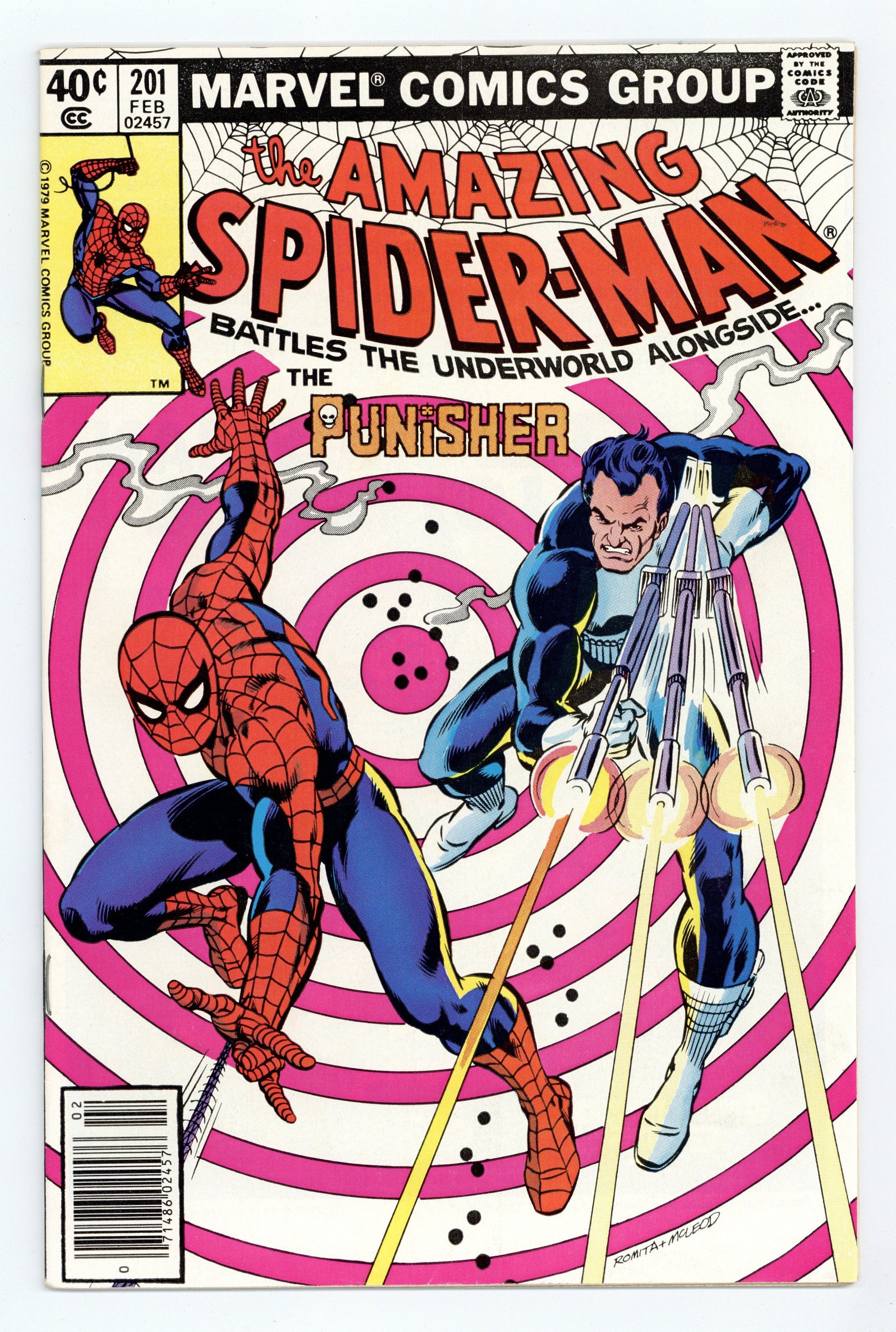 Starts May 4 Newsstand Edition. "One for Those Long Gone!" Part 2 of 2. Guest-starring the Punisher. Script by Marv Wolfman. Art by Keith Pollard (breakdowns) and Jim Mooney (finishes). Cover by Keith Pollard and Joe Rubinstein. After surviving his nervous encounter with the Punisher, Peter Parker slips on his red and blue costume and joins the gun-toting vigilante's pursuit of the drug lords! Spider-Man wants to capture them. The Punisher wants to kill them. Something has got to give! Will the superhero or the anti-hero win the battle of wills? Cameo appearances by J. Jonah Jameson, Joe Robertson, and Dr. Jonas Harrow. (Notes: Spider-Man and the Punisher tangle again in Amazing Spider-Man Annual 15. This issue includes a sideways full-page ad featuring Batroc the Leaper promoting Crazy Magazine. This story was reprinted in Marvel Tales 219.) 36 pages Cover price $0.40.
