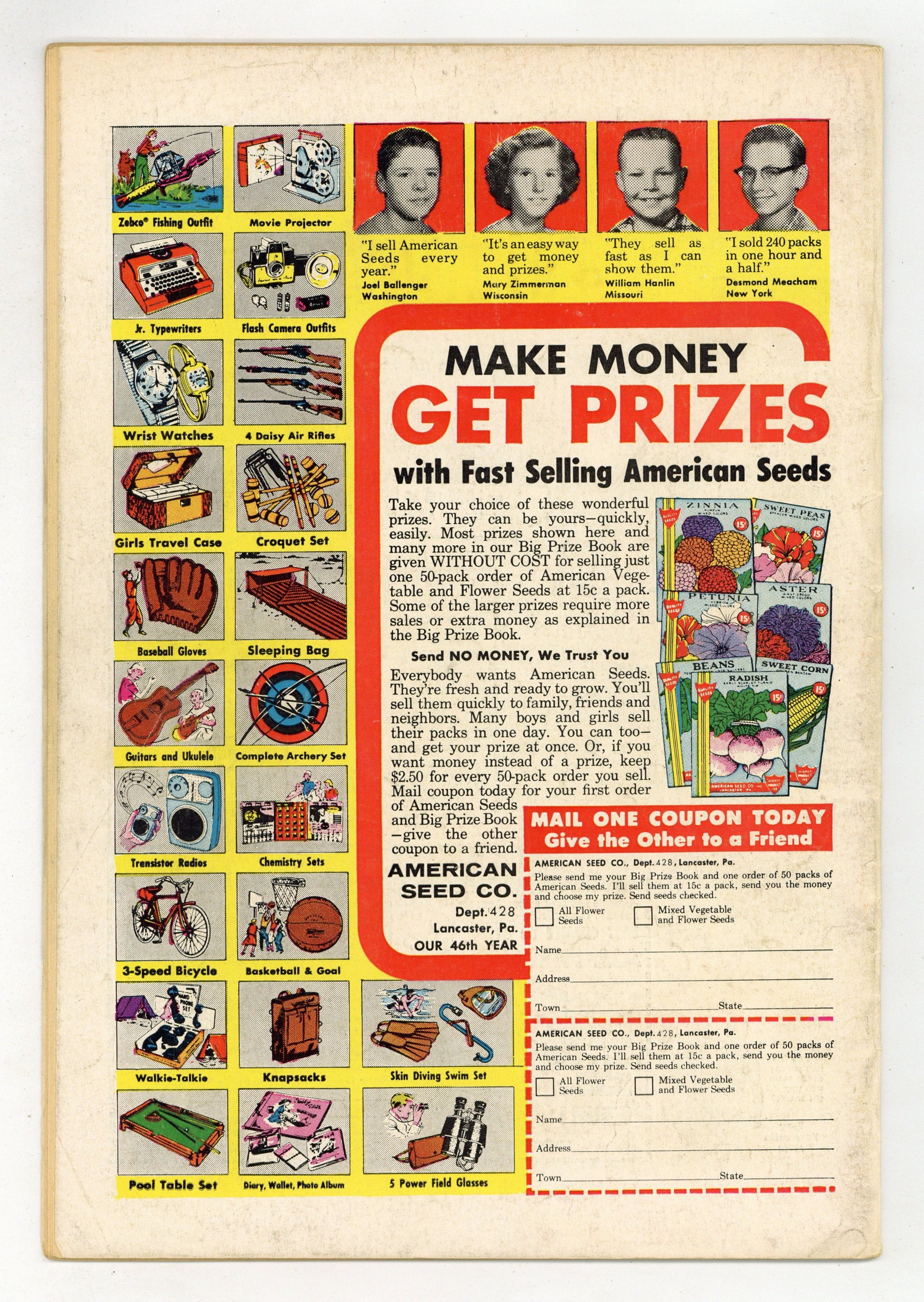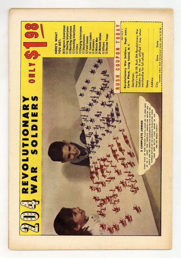 Starts Dec 22 Written by John Broome. Art by Sheldon Moldoff and Joe Giella. Cover by Carmine Infantino and Joe Giella. The Midnight Raid of the Robin Gang!; Dick tries to talk one of his friends out of dropping out of school and stumbles into a crime spree, masterminded by Al Craig; Craig plans to use drop-outs, dressed as Robin, to commit burglaries all over Gotham at midnight. Written by John Broome. Art by Carmine Infantino and Sid Greene. The Bandits and the Baroness! starring Ralph Elongated Man Dibny and his wife, Sue Dibny. Missive from letter hack Guy H. Lillian III. Rocky and Bullwinkle star in a one-page Cheerios ad. 36 pages, full color. $0.12. Cover price $0.12.
