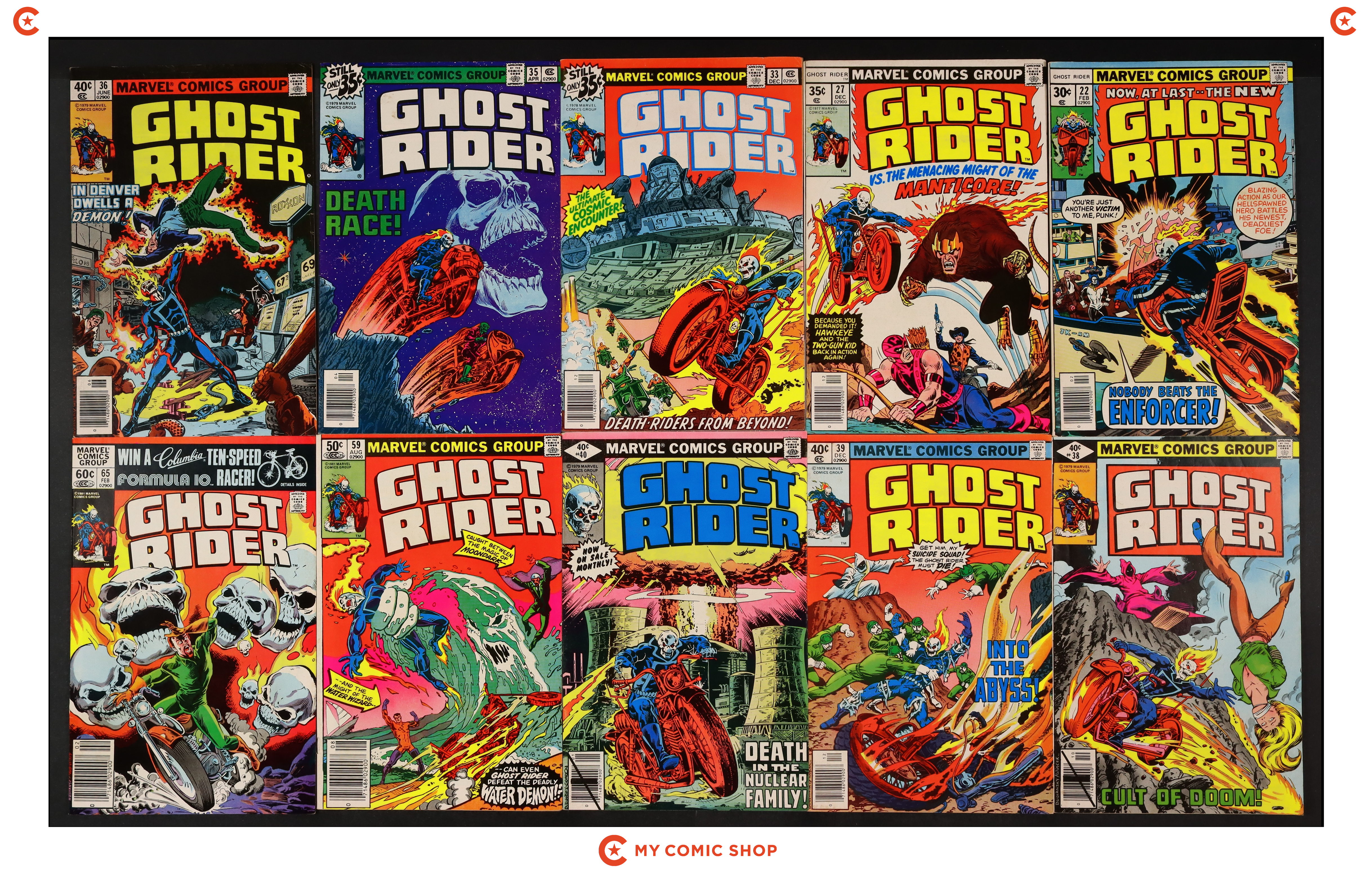 Issues 22, 27, 33, 35, 36N, 38, 39, 40, 59, and 65 of Ghost Rider (1973 1st Series). Most will grade in the VG to FN range.