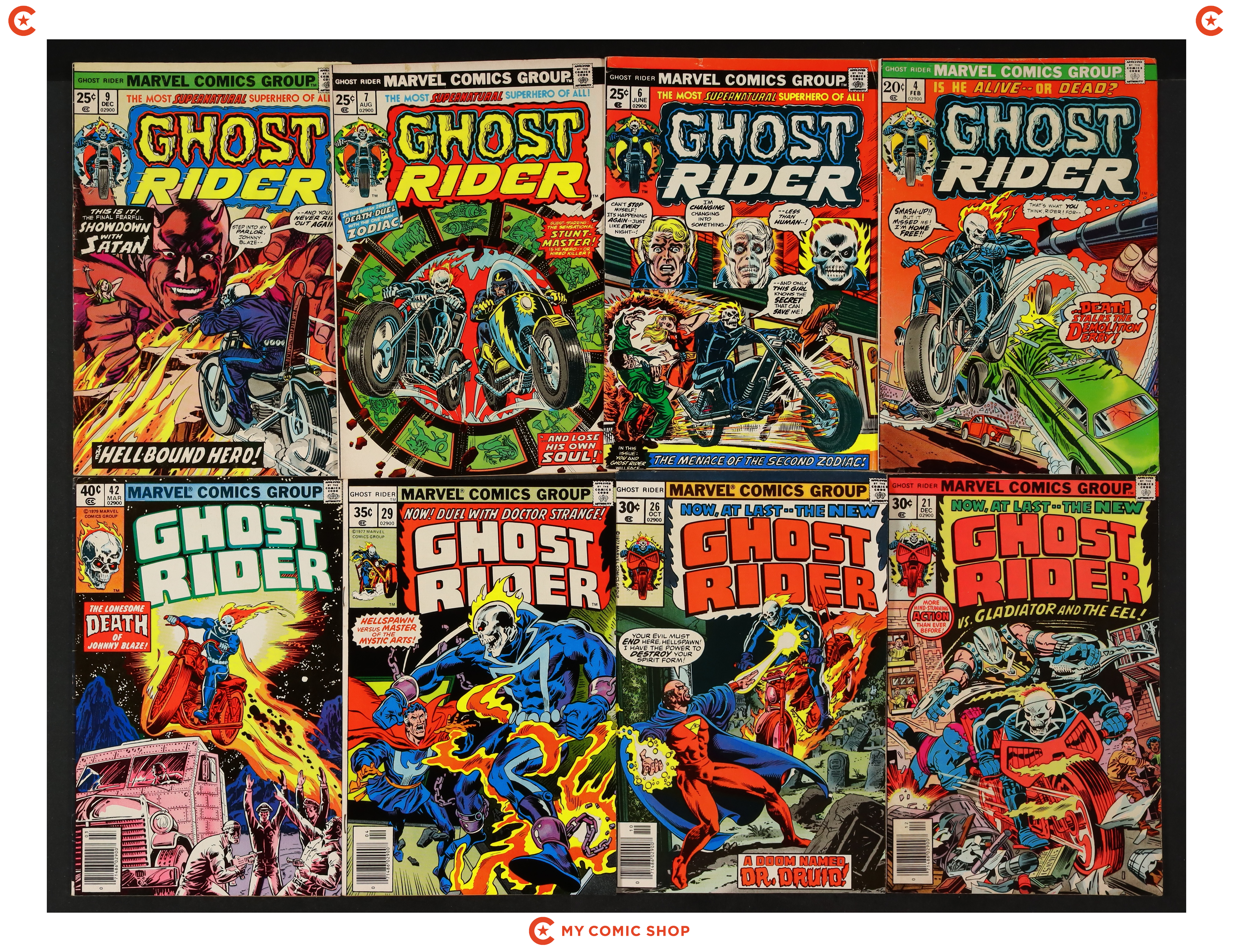 Issues 4, 6, 7, 9, 21, 26, 29, and 42 of Ghost Rider (1973 1st Series). Most will grade in the VG to FN range with #9 grading GD.