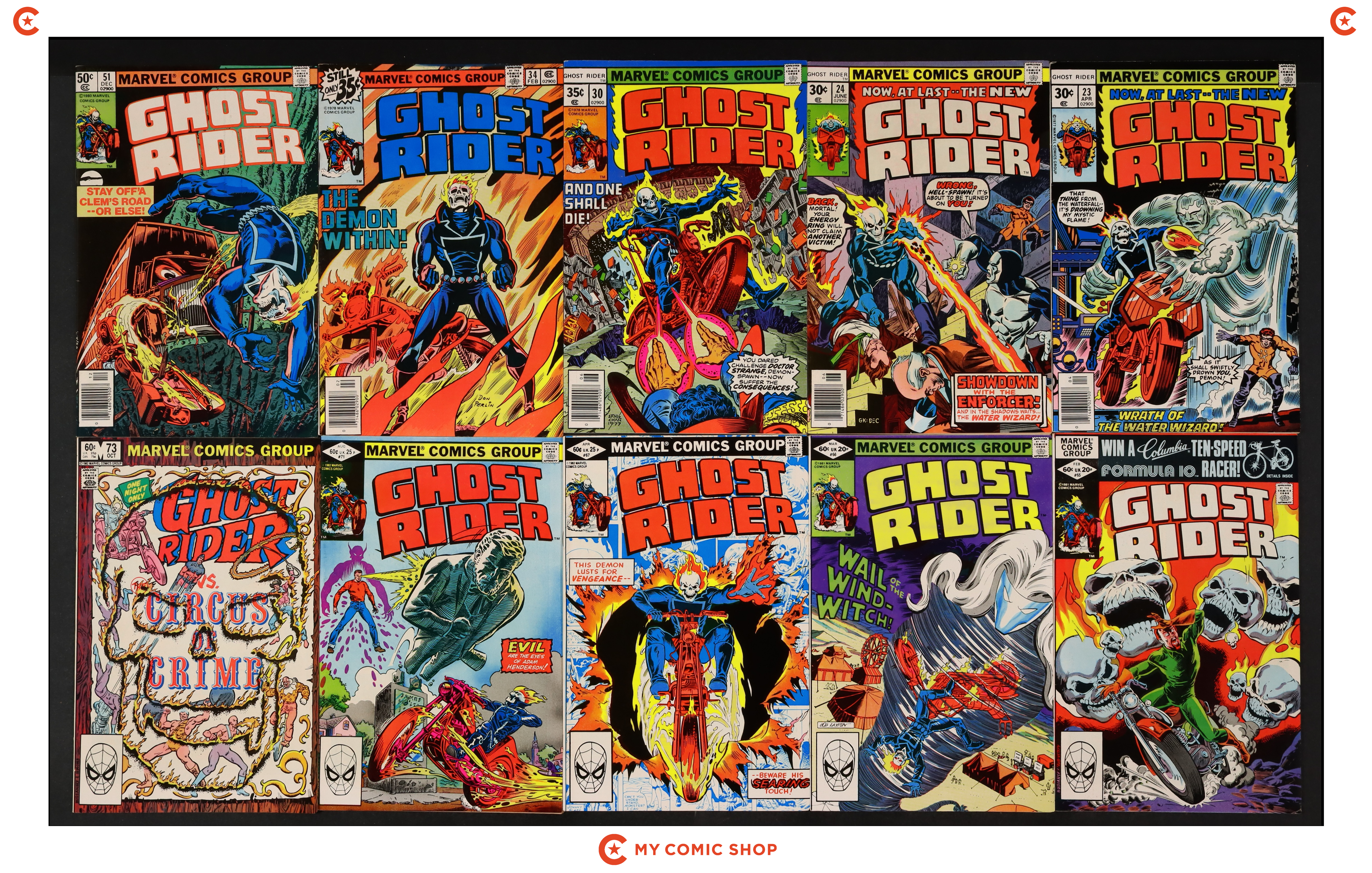 Issues 23, 24, 30, 34, 51N, 65-67, 71, and 73 of Ghost Rider (1973 1st Series). Most will grade in the FN/VF to FN range.
