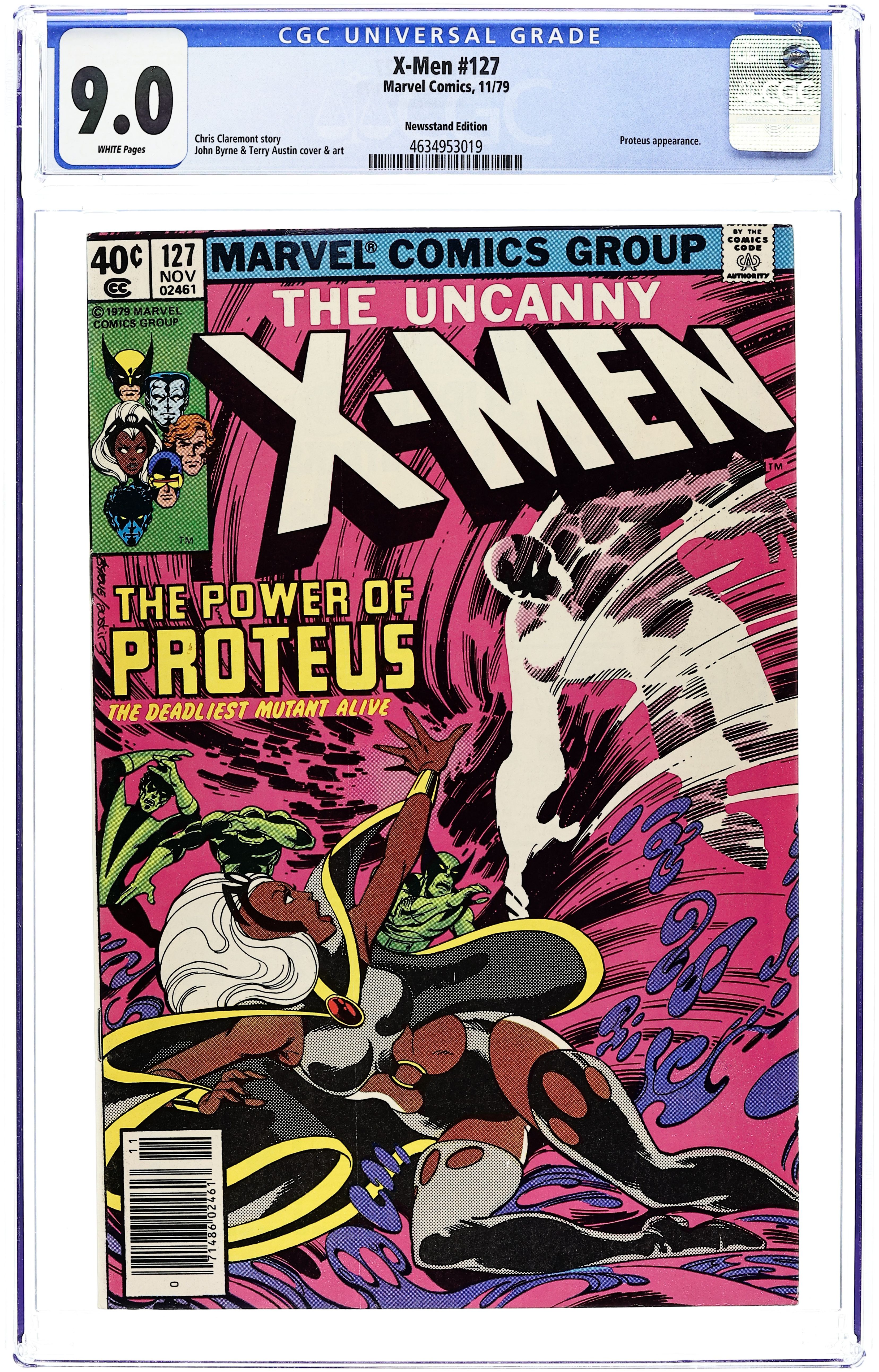 Starts Mar 23 Direct Edition. As the cover says: the dramatic return of Phoenix! "There's Something Awful on Muir Island!" "...!" Story by Chris Claremont and John Byrne. Art by John Byrne and Terry Austin. First appearance of Mutant X (Proteus). 36 pgs. Cover price $0.40.
