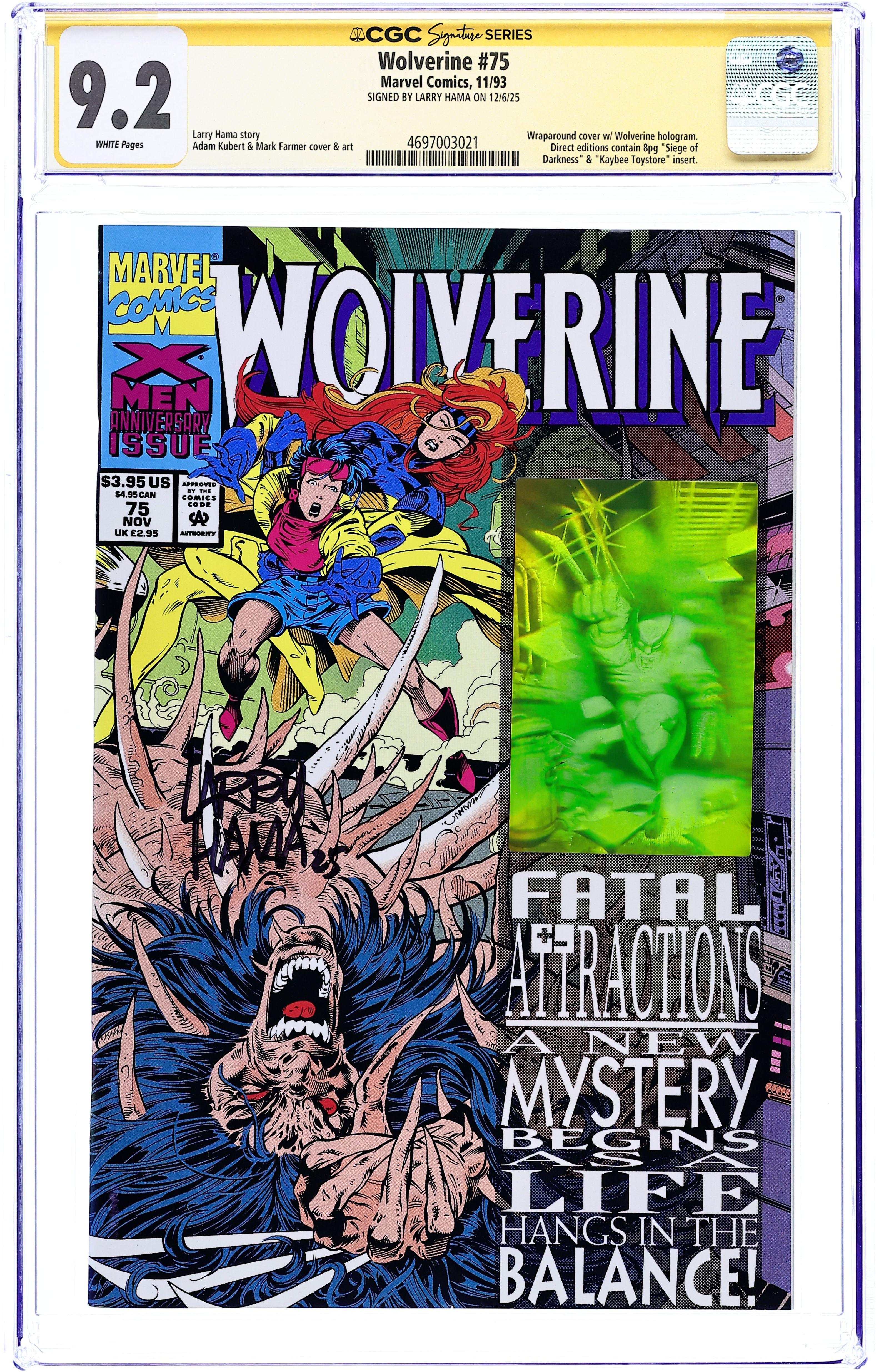 Starts Mar 9 Direct Edition. Fatal Attractions: Part 5 of 6 - Hologram card on cover - "Nightmares Persist!" Guest-starring the X-Men. Written by Larry Hama. Art by Adam Kubert, Mark Farmer, Dan Green, and Mark Pennington. Story continued from X-Men (1991-2008 1st Series) #25 - The storyline that changed the feral X-Man's life continues! Magneto, the Master of Magnetism, just sucked out all the Adamantium in Wolverine's body, leaving him a bloody, pulpy mess. First appearance of Wolverine's bone claws. Can even Wolverine's vaunted healing factor save him this time? Can Jean Grey's mutants powers keep his body in one piece long enough for it to try? Story concludes in Excalibur #(1988 1st Series) #71. 32 pages, FC NOTE: Adam Kubert jumps on board with issue joining Larry Hama on a run that will some of the finest Wolverine stories to date. In a time of Clone Sagas, Heroes Reborn, and watered down tough guys with guns comics, the Kubert/Hama run on Wolverine (along with the Age of Apocalypse storyline) kept me reading comics long enough for them to get good again. - Odinson, Lone Star Comics Archivist Cover price $3.95.