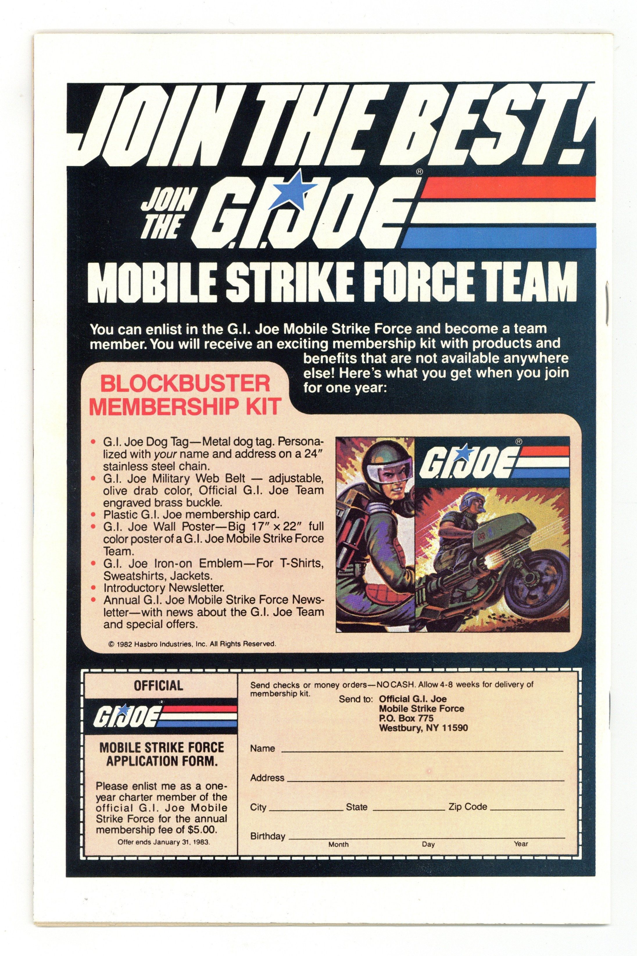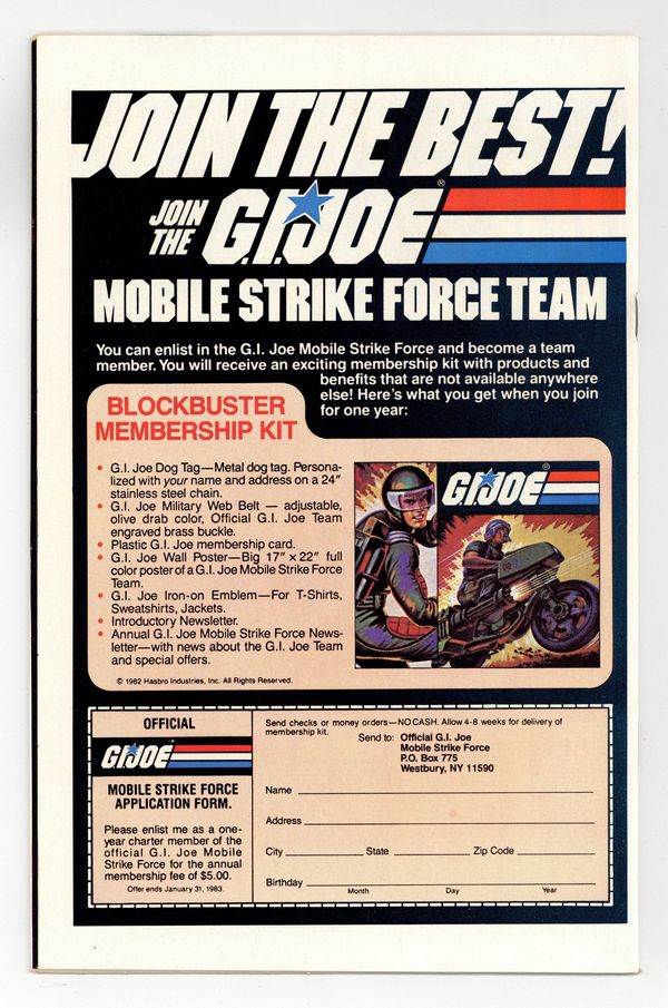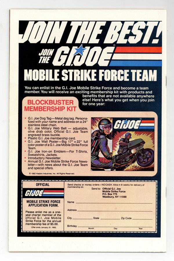 Ends Feb 23 8:15 PM CST Bid History 12 bids Current Bid $135 Your Secret Max Bid If you'd like to bid, please log in or register. Direct Edition. Giant size issue - "Operation: Lady Doomsday!" Written by Larry Hama. Art by Herb Trimpe and Bob McLeod. Cobra is a sinister terrorist organization bent on world domination! There is only one thing standing in their way - GI Joe, the free world's elite strike force and a band of highly trained super soldiers who fight for freedom, justice and the American way. Yo, Joe! 1st appearance of Hawk, Snake-eyes, Scarlett, Clutch, Rock 'n' Roll, Stalker, Breaker, Flash, Grand Slam, Short-Fuse, Grunt, Cobra Commander and the Baroness. Includes back-up story "Hot Potato!" Written by Larry Hama. Art by Don Perlin and Jack Abel. Starring Snake-eyes, Scarlett, and Rock 'n' Roll. Also includes a 2-page diagram of "The Pit," the G.I. Joe Command Center. 52 pages, FC. Cover price $1.50.