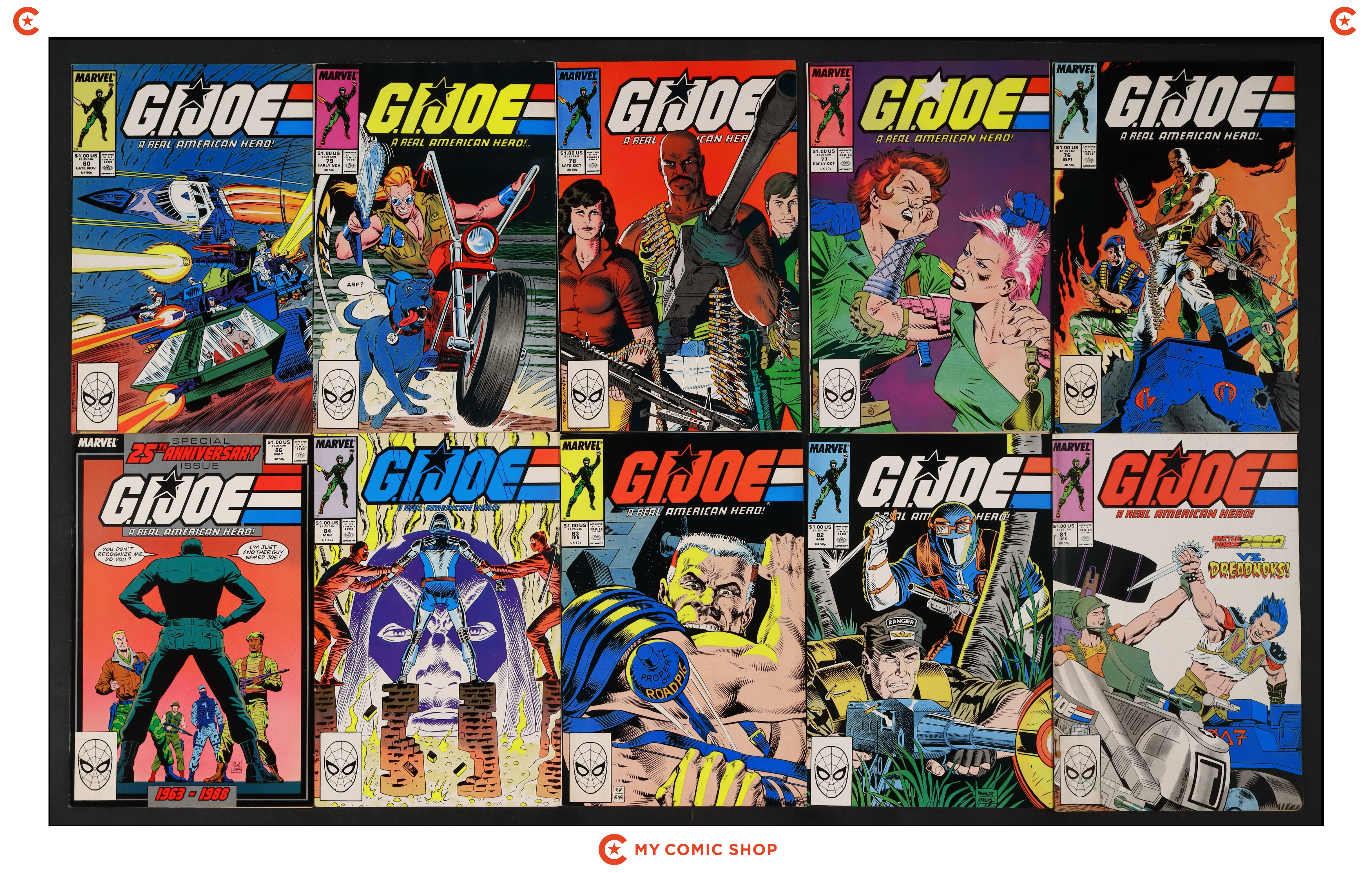 Issues 76D, 77, 78D, 79-82, 83D, 84D, 86 of GI Joe A Real American Hero (1982 Marvel). Most will grade in the GD/VG to FN/VF range.