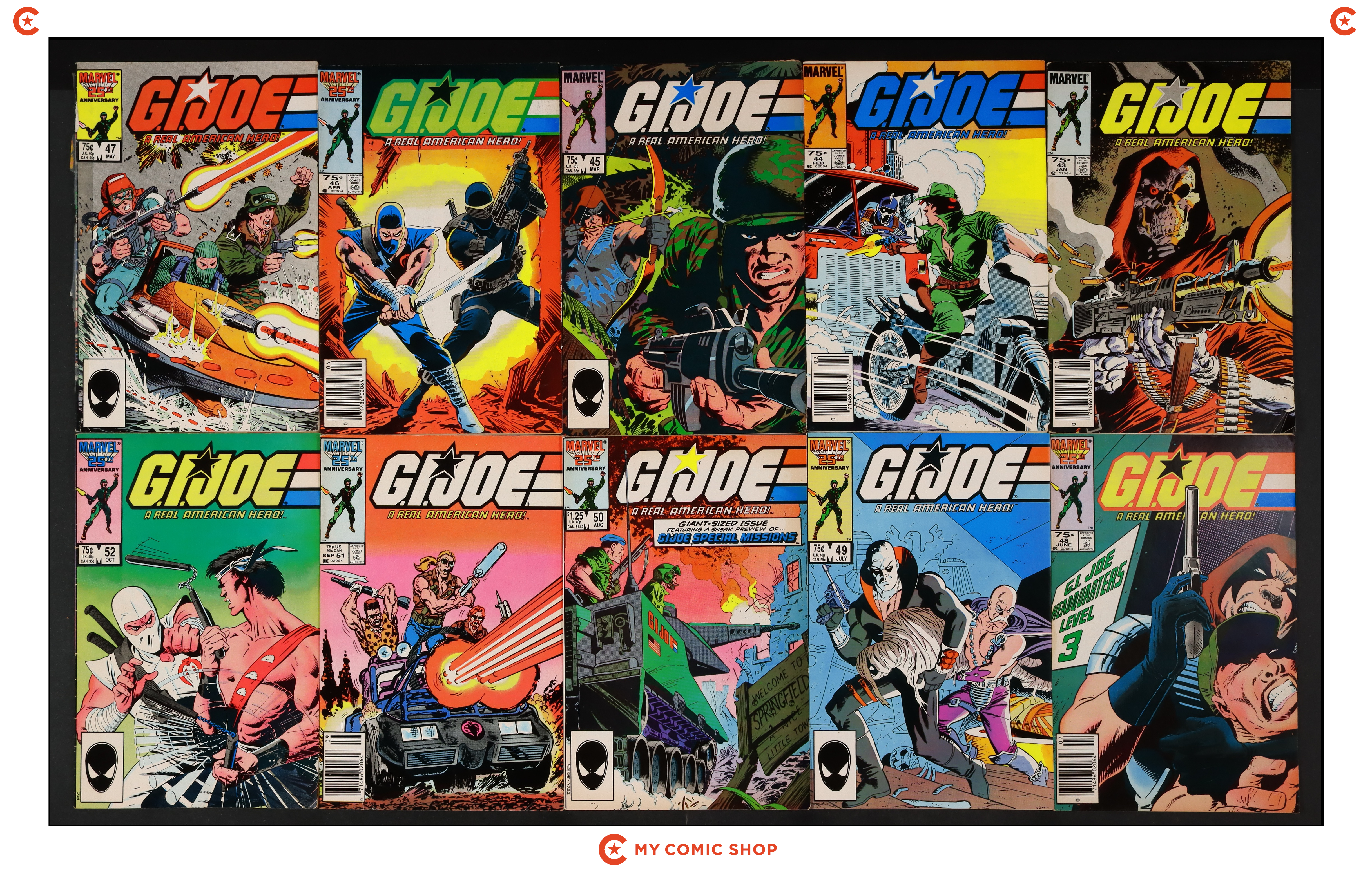 Issues 43, 44N, 45, 46N, 47D, 48-51, 52D of GI Joe A Real American Hero (1982 Marvel). Most will grade in the GD/VG to FN+ range, with 47 grading at FR.