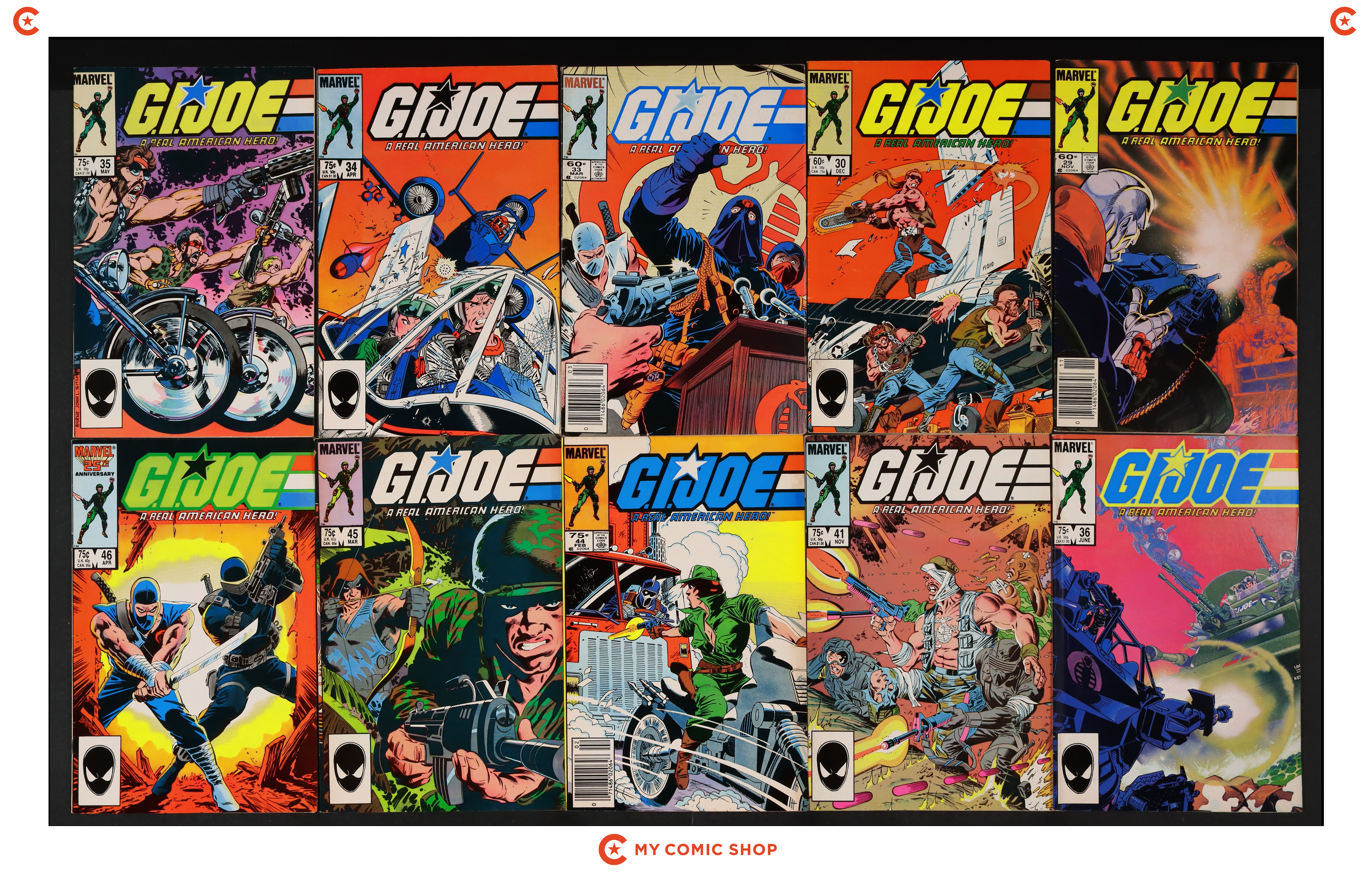 Issues 29, 30, 33, 34REP.2ND, 35, 36D, 41, 44N, 45, 46D of GI Joe A Real American Hero (1982 Marvel). Most will grade in the VG- to FN range.