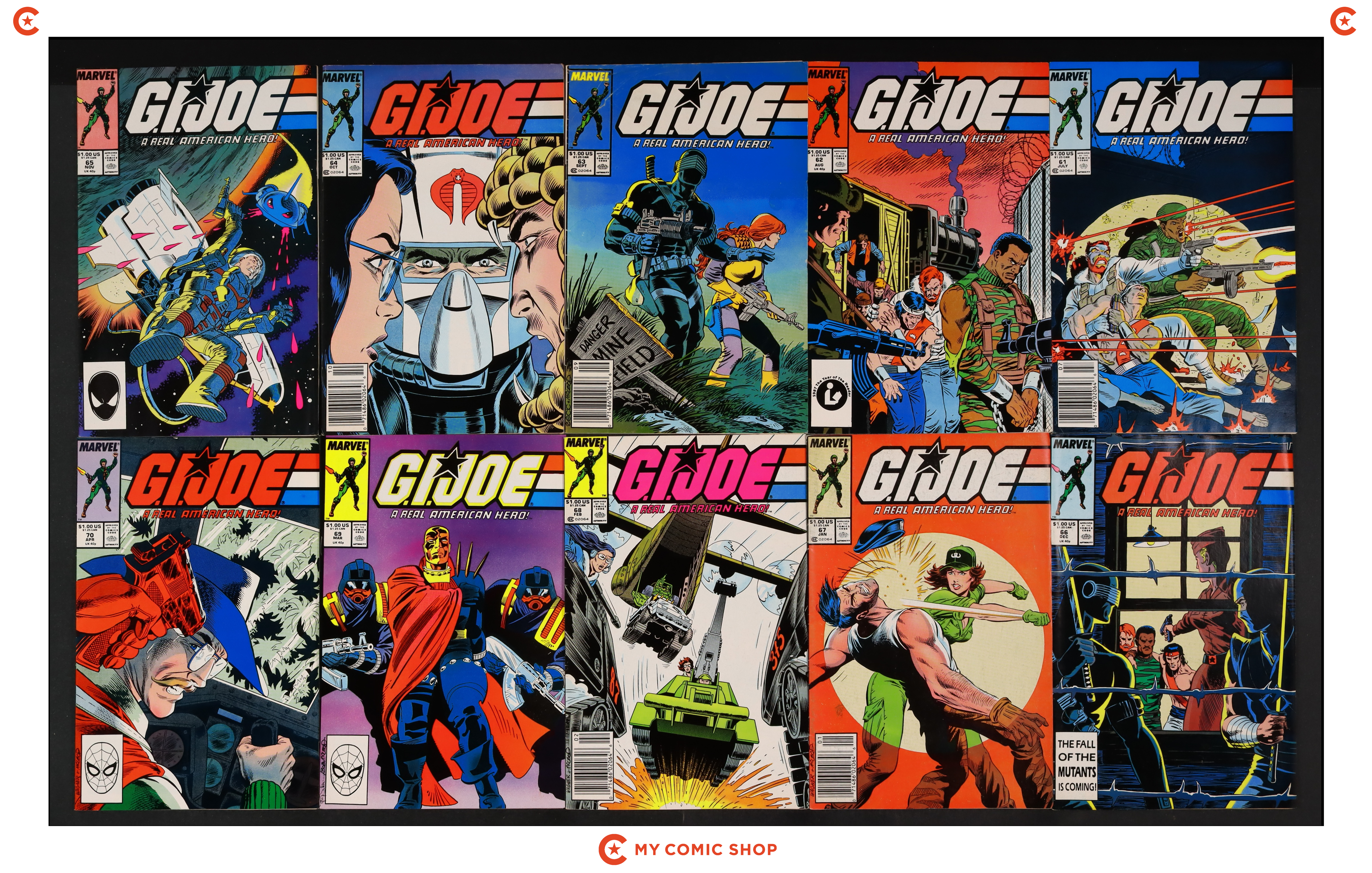 Issues 61-66, 67N, 68, 69, 70D of GI Joe A Real American Hero (1982 Marvel). Most will grade in the VG+ to FN+ range, with 63 grading at FR.