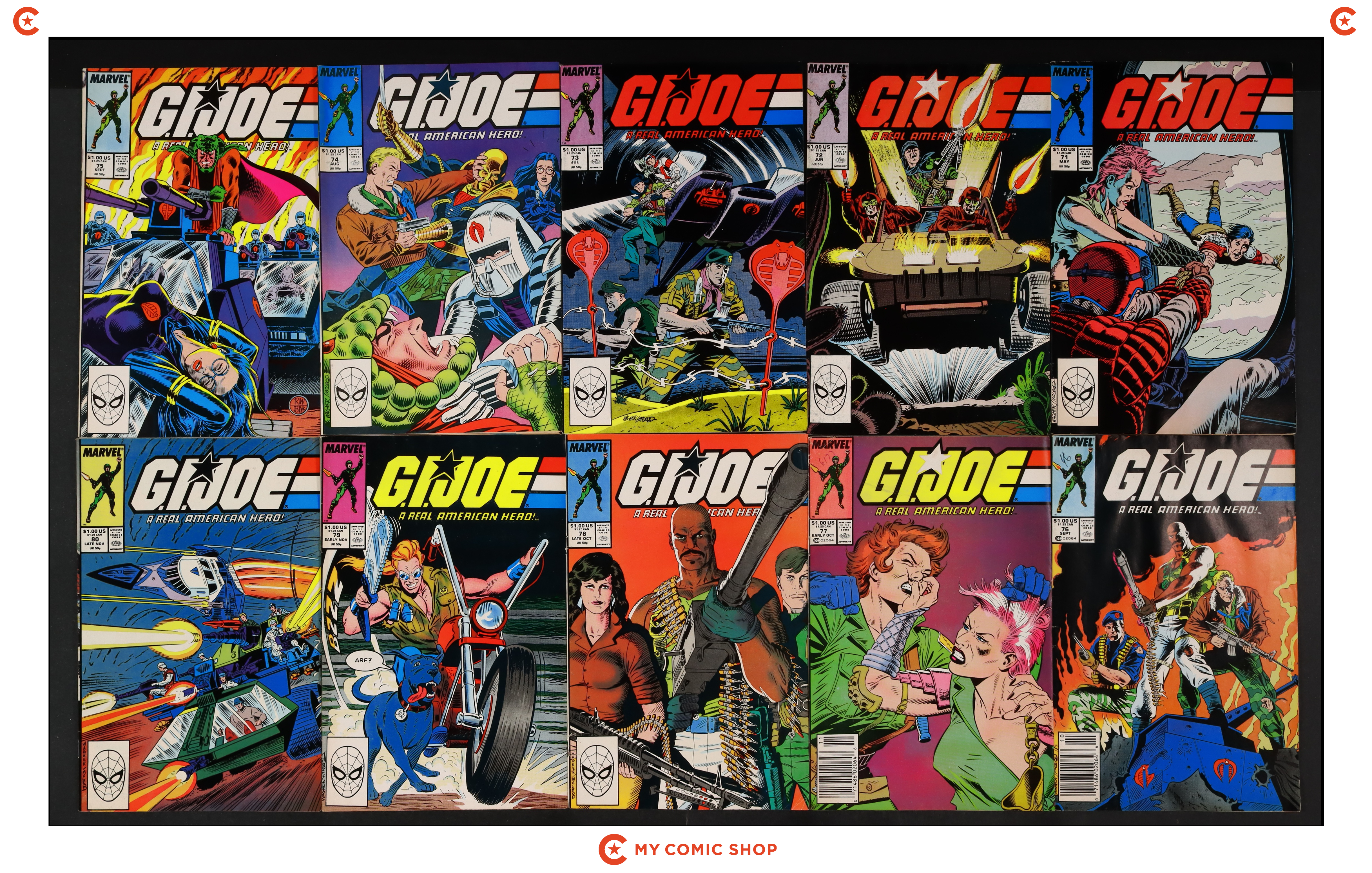 Issues 71-74, 75D, 76N, 77, 78D, 79, 80 of GI Joe A Real American Hero (1982 Marvel). Most will grade in the GD/VG to FN- range.